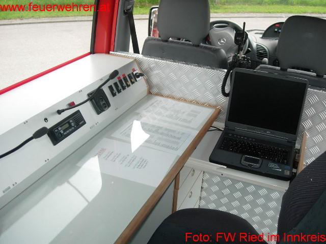 Zur Anbindung an die mediale Außenwelt steht eine Telefon-Fax Kombination zur Verfügung. Weiters ist ein Note-Book mit Drucker, auf dem eine Gefahrgut-Datenbank, A-Map und zahlreiche andere Programme gespeichert sind, eingebaut. Im Innenraum befinden sich auch noch alle wichtigen Einsatzunterlagen, eine Digitalkamera und ein Feldstecher. An Einsatzgeräten stehen ein Beleuchtungsballon, ein Atemschutzerkundungsgerät, Warn-, Beleuchtungs- und Absperrmaterial, eine Wärmebildkamera, Türöffnungswerkzeug, Insektenbekämpfungsausstattung, ein Drucklöschgerät der Type Hydrofix, Handfeuerlöscher, ein schallisolierter Stromerzeuger, ein Megaphon sowie eine Teleskopleiter zur Verfügung. An der Außenseite ist eine Markise montiert. Dazu gehört noch eine Biertischgarnitur für Einsatzbesprechungen.