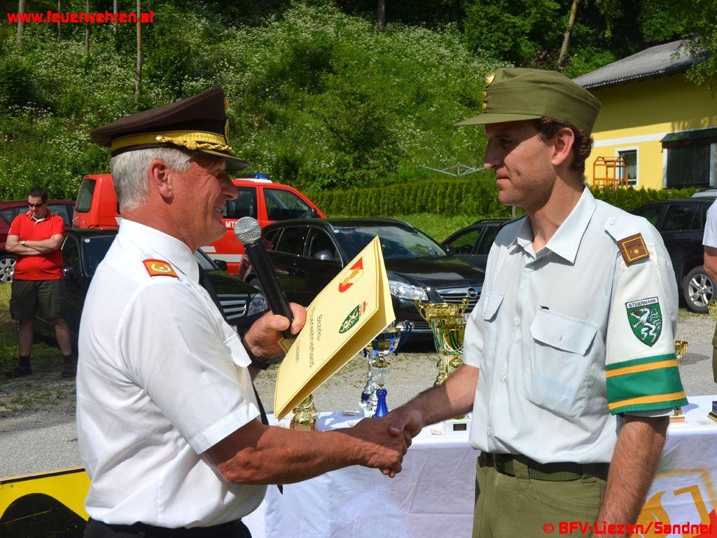 Bevor jedoch die eigentliche Siegerehrung begann, standen noch eine Ehrung und Auszeichnungen verdienter Feuerwehrkameraden auf der Tagesordnung. Die Bewerter LM d.F. Roland Prill erhielt das Bewerterabzeichen in Bronze für mehr als 5-malige Bewertertätigkeit. Der Bereichsbeauftragte für die Feuerwehrjugend Christian Sotlar wurde zum Oberbrandinspektor des Fachdienstes (OBI d.F.) befördert.