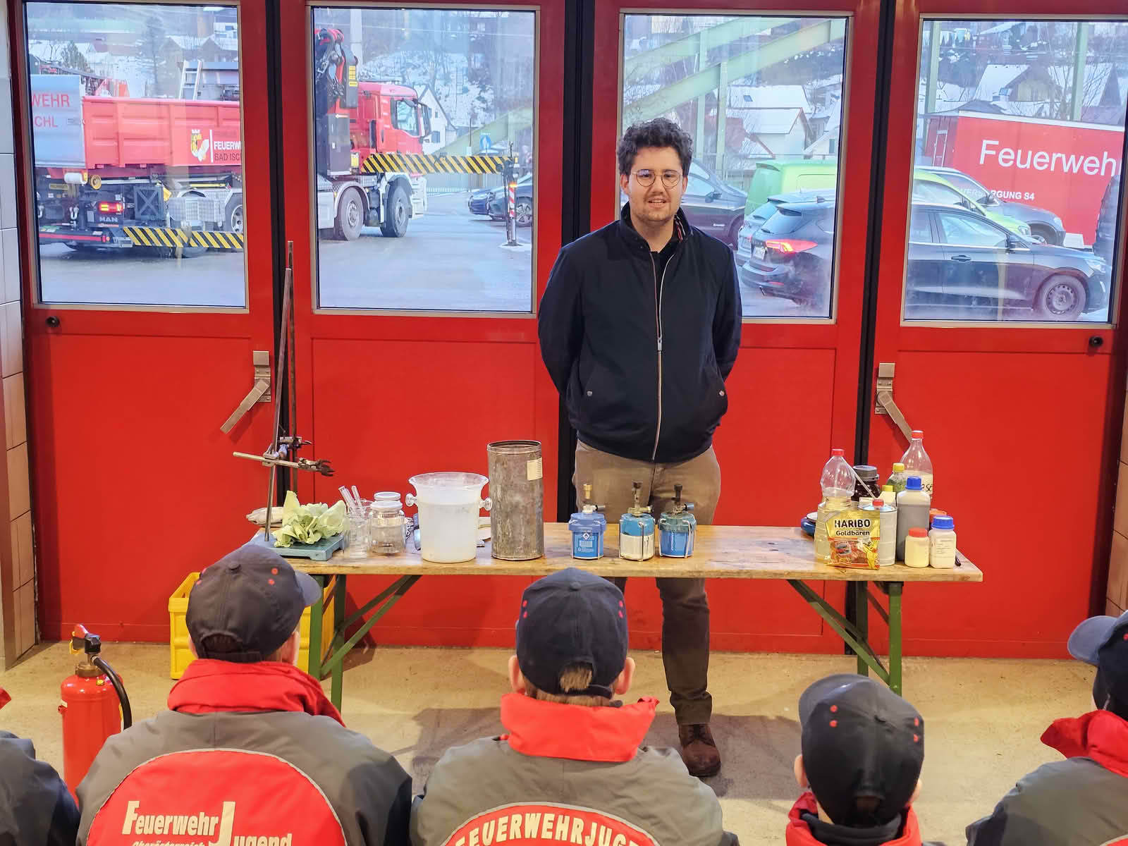 Nach dem Theorieteil wurde die Fahrzeughalle kurzerhand zum Chemiesaal umfunktioniert.