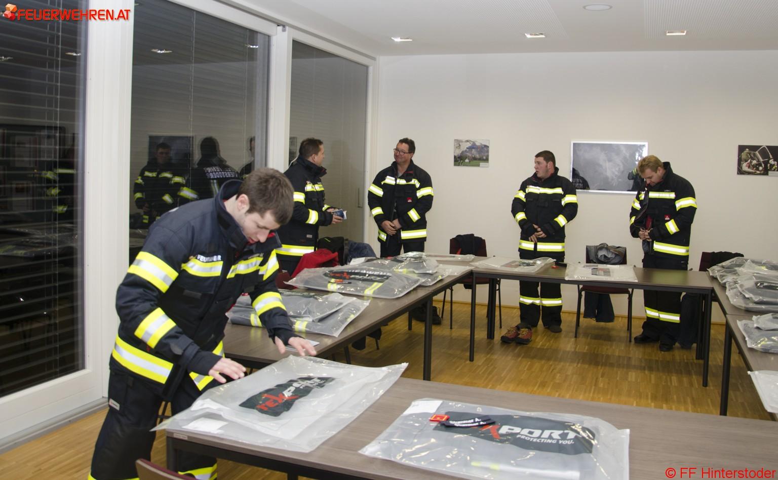 Die bisher in der Feuerwehr Hinterstoder verwendeten Jacken waren bereits 20 Jahre im Einsatz. Der Zahn der Zeit hat bereits am Aufbau (Membrane usw.) genagt und so waren die Einsatzkräfte bereits nach kurzer Zeit entweder nass oder durchgeschwitzt. In einem Kommandobeschluss im Frühjahr wurde die Firma Texport aus Salzburg vertreten durch die Fa. Scheureder Protection Equipment als Lieferant der neuen Einsatzbekleidung ausgewählt. Ein etwas verspätetes Christkind hat daher am 30.12.2015 einen Teil der Einsatzmannschaft erreicht. Die neue Bekleidung konnte durch den Feuerwehrkommandanten im Beisein von Bürgermeister Helmut Wallner an die anwesende Mannschaft übergeben werden. Gemeinsam mit den im Herbst 2014 beschafften Helmen konnte die persönliche Schutzausrüstung der Einsatzkräfte auf den neuesten Stand der Technik gebracht werden. Die Bekleidung wurde aus den Eigenmitteln der Feuerwehr Hinterstoder finanziert. Möglich ist das nur durch die Unterstützung der Bevölkerung bei der jährlichen Haussammlung sowie bei den Festveranstaltungen. Ein herzliches Dankeschön dafür!