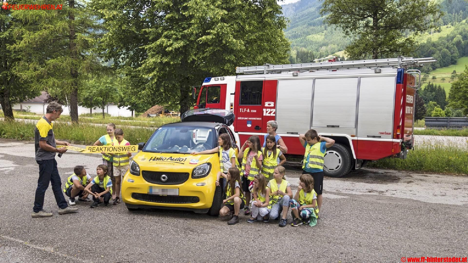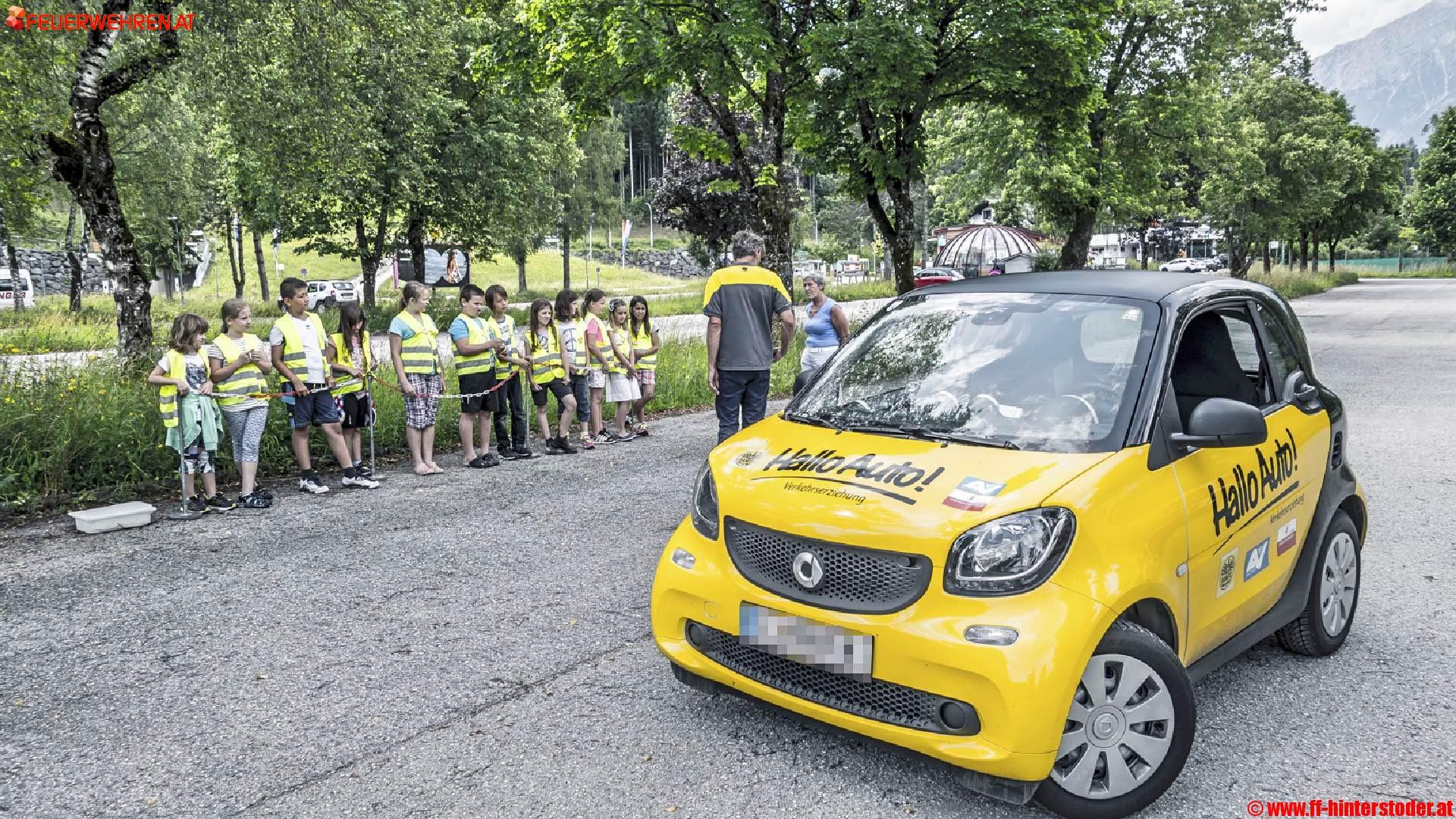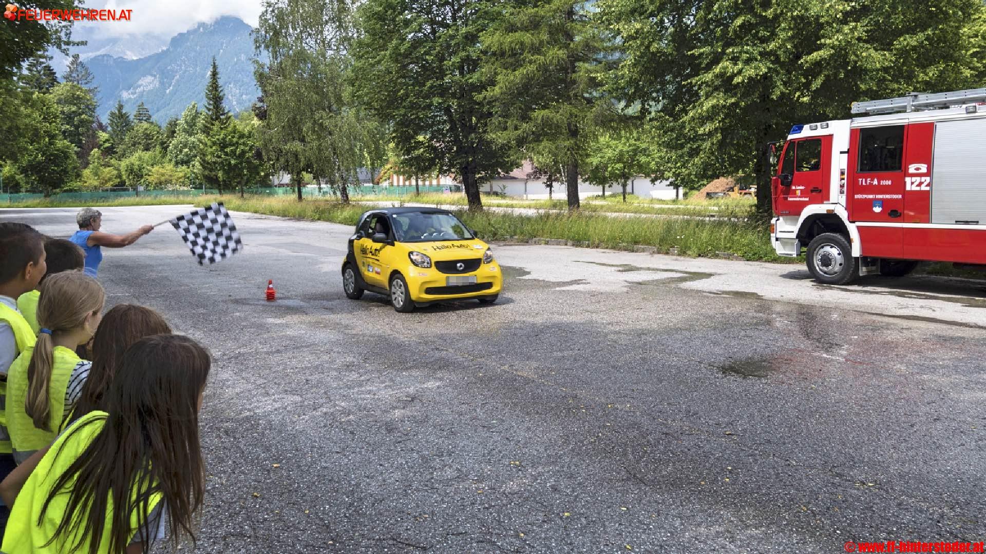 Zuerst wird spielerisch der Bremsweg ermittelt. Danach dürfen die Kinder den Anhalteweg schätzen. Als Höhepunkt ist das Durchführen einer Vollbremsung am Programm. Die Feuerwehr Hinterstoder unterstützt diese sinnvolle Aktion bereits zum zweiten Mal und simuliert durch Bewässern des Parkplatzes eine nasse Straße. Den Kindern hat dieser kurzweilige Vormittag sicher viel Spaß und Action und bereitet und nebenbei wurden viele lebenswichtige Sachen für das weitere Leben gelernt.