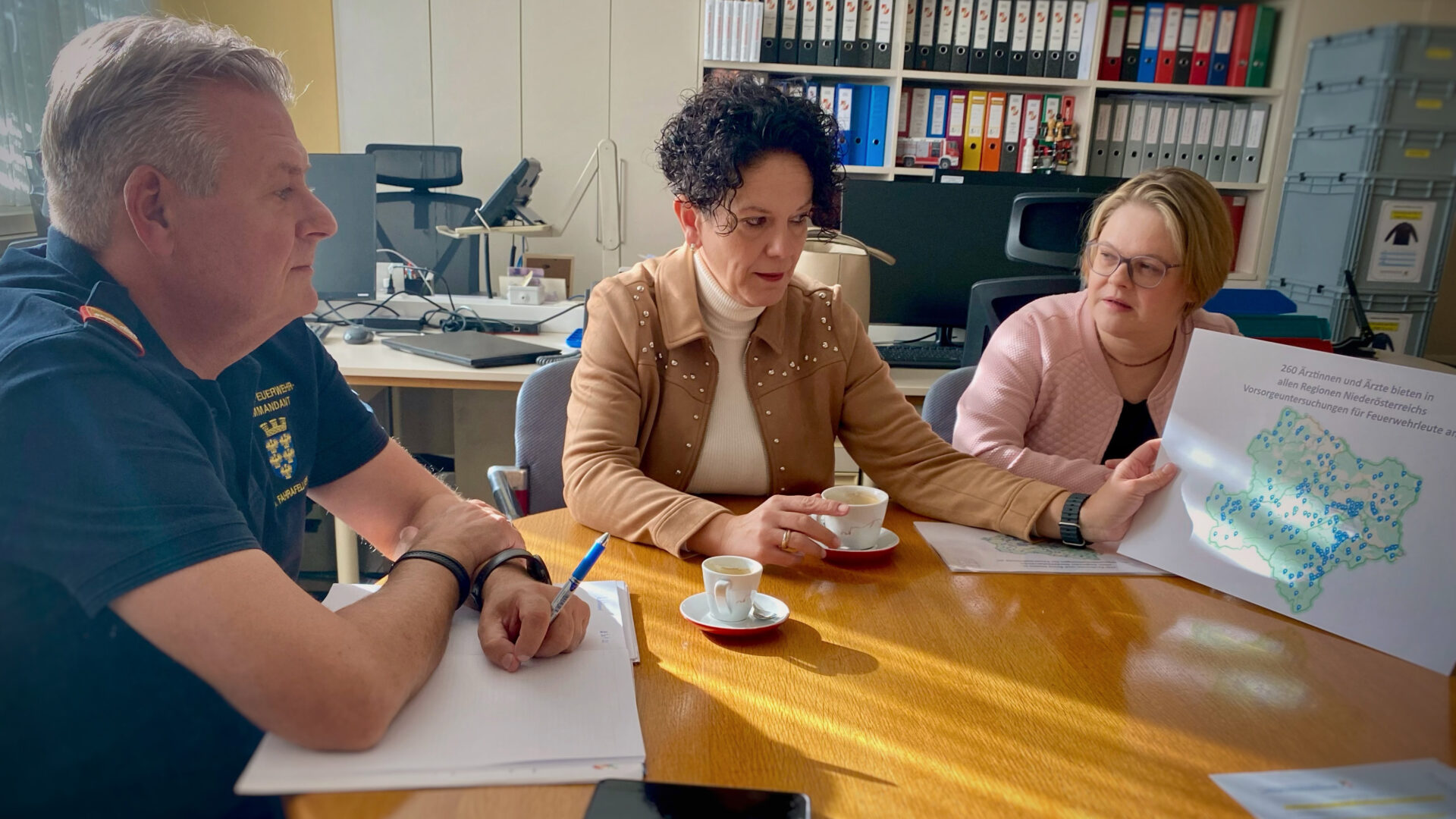 Um den niederschwelligen Zugang zur ärztlichen Basisuntersuchung sicherzustellen, hat die Ärztinnen- und Ärztekammer für Niederösterreich (ÄKNÖ) einen Aufruf gestartet. 260 Ärztinnen und Ärzte in ganz Niederösterreich bieten diese Untersuchung auch für Feuerwehrmitglieder an, die nicht zu ihrem eigenen Patientenstamm gehören. Die nach Gemeinden geordnete Liste wurde am 30. September von Dr. Dagmar Fedra-Machacek, Vizepräsidentin und Kurienobfrau der niedergelassenen Ärztinnen und Ärzte, und Dr. Karoline Tauchmann, Kurienobfrau-Stellvertreterin, an den Landesfeuerwehrkommandanten von Niederösterreich, Dietmar Fahrafellner, MSc, übergeben.