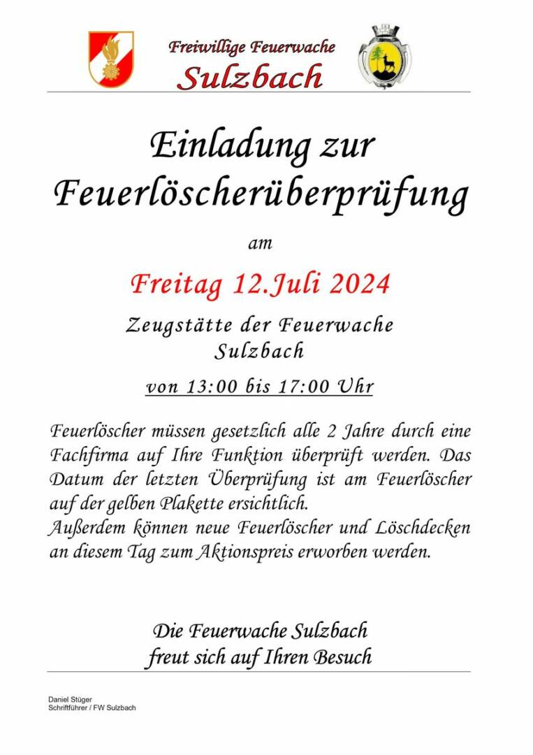 Am Freitag, den 12. Juli 2024 findet von 13:00 bis 17:00 Uhr im Feuerwehrhaus der Feuerwache Sulzbach eine Feuerlöscherüberprüfung statt.