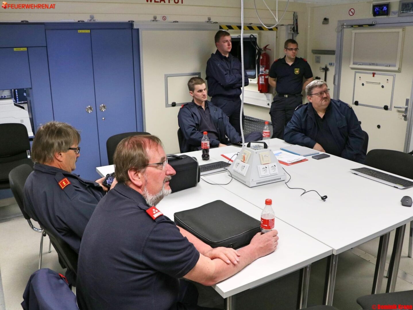 Bei der Besichtigung wurde der gesamte Funktionsumfang des Containers vorgestellt und eine kurze Einschulung auf den Geräten und der verbauten Technik durchgeführt. „Es ist Wichtig, dass wir wissen welche Möglichkeiten uns der Führungscontainer im Ernstfall bieten kann“, so Michael Preissl, Kommandant der 5. Katastrophenhilfsdienst-Bereitschaft bei der Besichtigung. Und die Möglichkeiten sind vielfältig: Neben einem großen Besprechungsraum mit Smartboard und Infoscreens ist der bis zu zehn Tonnen schwere Container beispielsweise mit drei Funkarbeitsplätzen für den Informationsaustausch, Highspeed Internet (welches bei Bedarf über Satellitenverbindung hergestellt werden kann), Satellitenfernsehen oder Heiz- und Klimageräten ausgestattet.