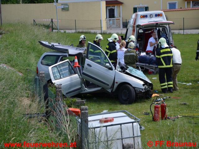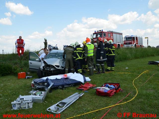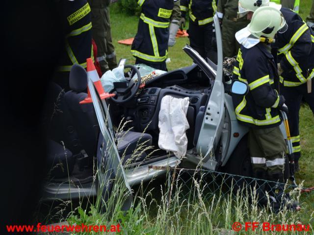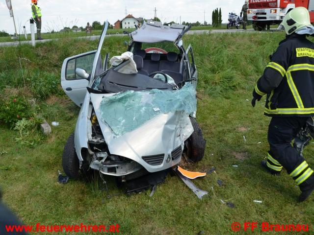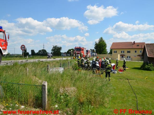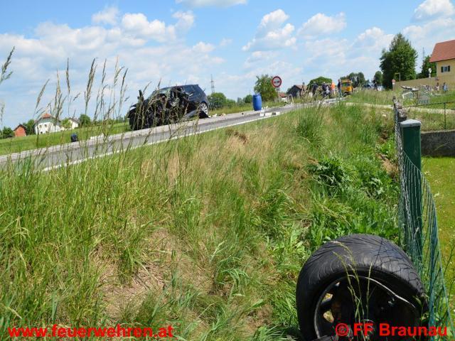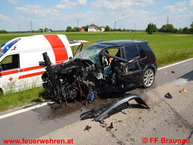 Aus bisher ungeklärter Ursache kollidierten auf der B147 – Braunau Richtung Kühberg – zwei Fahrzeuge auf der Fahrerseite frontal. Durch die Wucht des Aufpralls wurde ein Fahrzeug in den an die Strasse angrenzenden Garten geschleudert. Beim zweiten Fahrzeug wurde ein Rad abgerissen und in den Straßengraben geschleudert. Ein Fahrzeuglenker konnte ohne der Hilfe der Feuerwehr befreit werden. Der andere Lenker des Fahrzeuges wurde in seinem Wrack eingeklemmt und konnte unter Schwerstarbeit der FF Braunau und Burgkirchen nach rund 20 Minuten mittels drei hydraulischen Rettungsgeräten befreit werden und dem Rettungsdienst übergeben werden. Anschließend wurde von der FF Braunau noch die Straße von Trümmerteilen gereinigt und ausgetretene Betriebsflüssigkeiten gebunden. Nach der Straßenreinigung wurde die Fahrbahn von der Bundespolizei Braunau wieder für den Verkehr freigegeben.