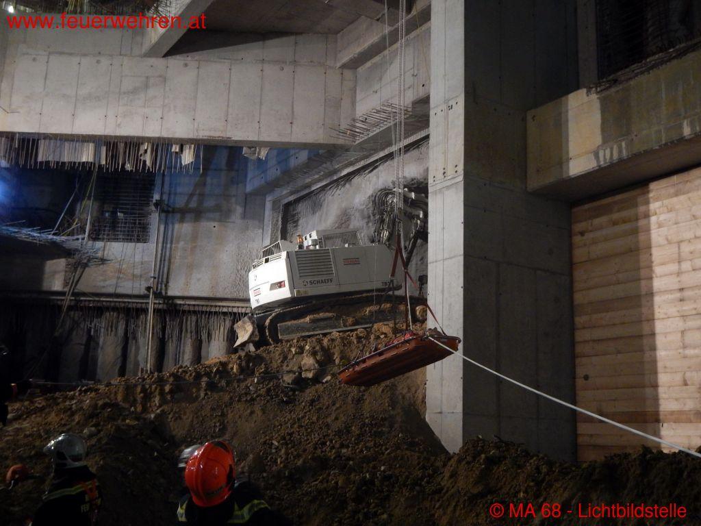 Im Zuge dieser Tätigkeiten lösten sich ca. 2 m³ Erdreich und verschütteten einen Arbeiter. Bei unserer Ankunft war der Arbeiter bereits vom Erdreich befreit, und somit konnte unverzüglich mit der Personenbergung begonnen werden.