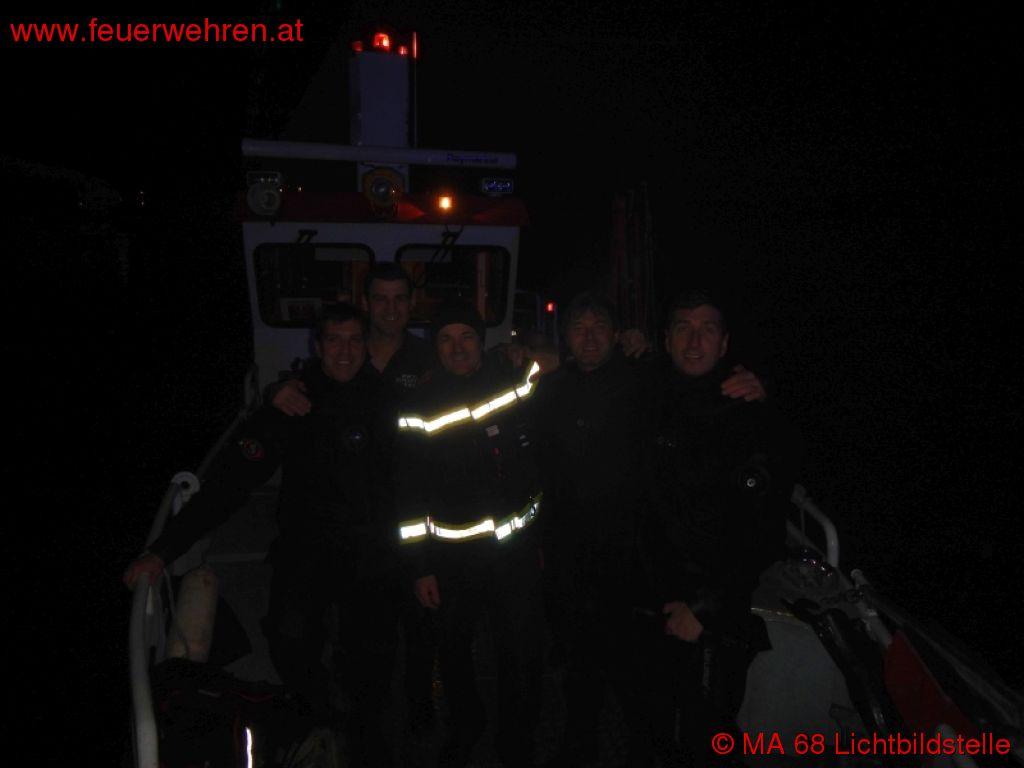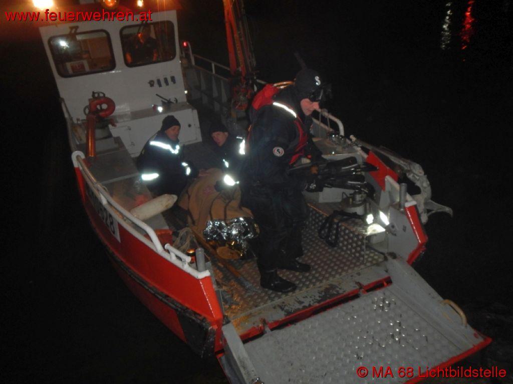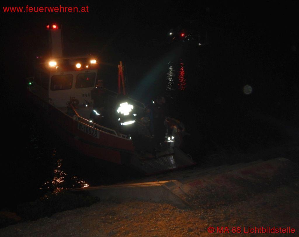 Sofort machten sich Einsatzkräfte der Berufsfeuerwehr Wien, darunter auch die Einsatztaucher, auf den Weg zur Einsatzstelle. Aufgrund der bereits herrschenden Dunkelheit war es äußerst schwierig die Person im Wasser aufzufinden. Ein am Ufer entdeckter Rucksack grenzte das Suchgebiet etwas ein und der Einsatz eines Feuerwehrbootes und einer Wärmebildkamera führten schließlich nach kurzer Zeit zum Erfolg. Die im Wasser treibende männliche Person wurde ins Boot gezogen und dort umgehend erstversorgt. Am Ufer wurde die Person an den bereits wartenden Rettungsdienst übergeben.