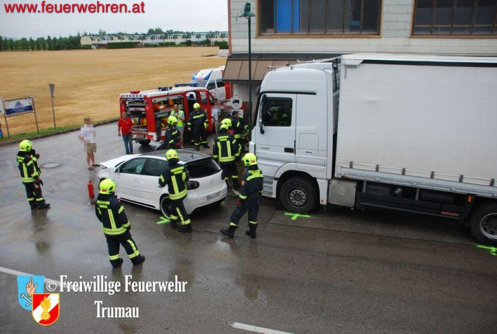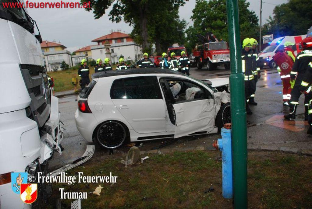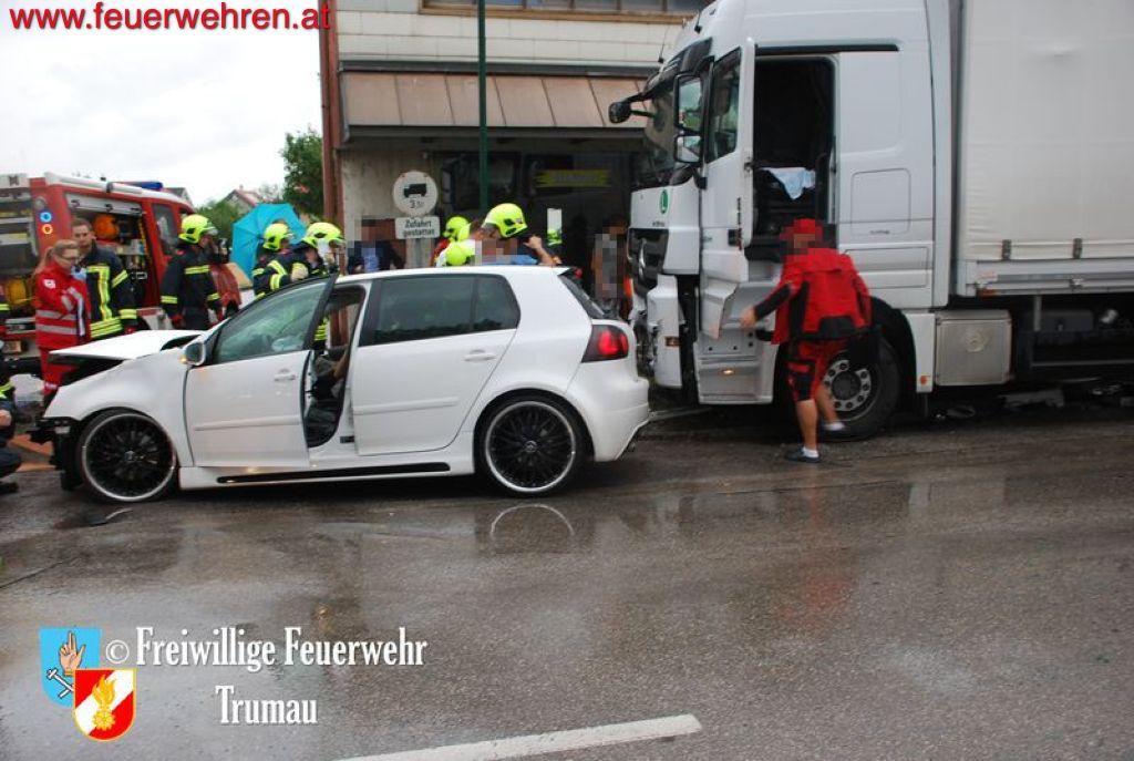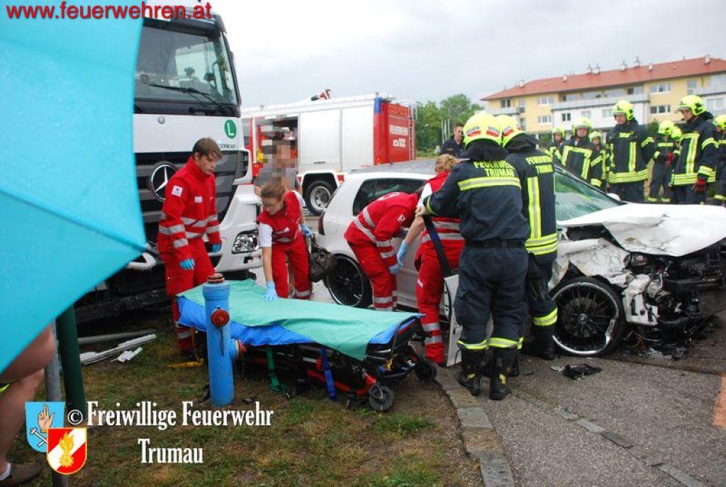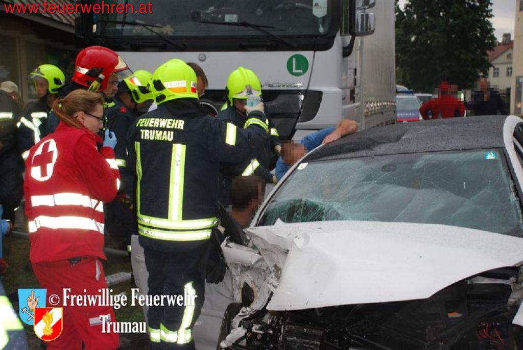 Der Fahrer des PKW’s brach sich den linken Fuß und seine schwangere Beifahrerin erlitt schwere Kopf- und Armverletzungen. Das Kind auf dem Rücksitz erlitt zum Glück nur leichte Prellungen. Durch das gleichzeitige Eintreffen von drei Ärzten der Feuerwehr Trumau konnten die Unfallopfer rasch bis zum Erscheinen der Rettungs- und Notarztwägen behandelt werden. Der LKW Fahrer kam glücklicherweise nur mit dem Schock davon.
