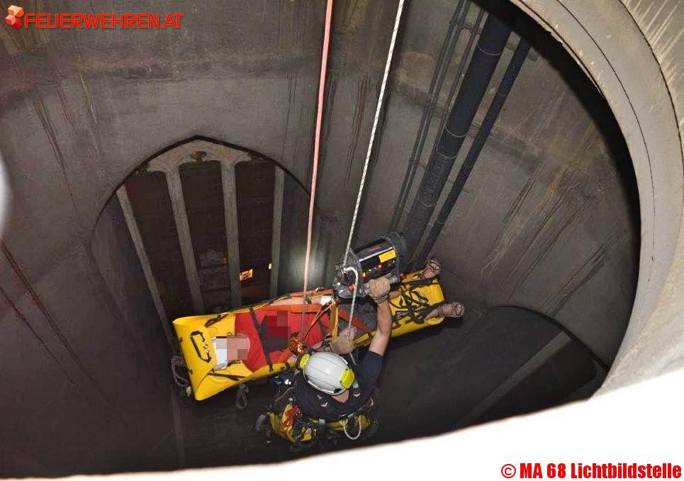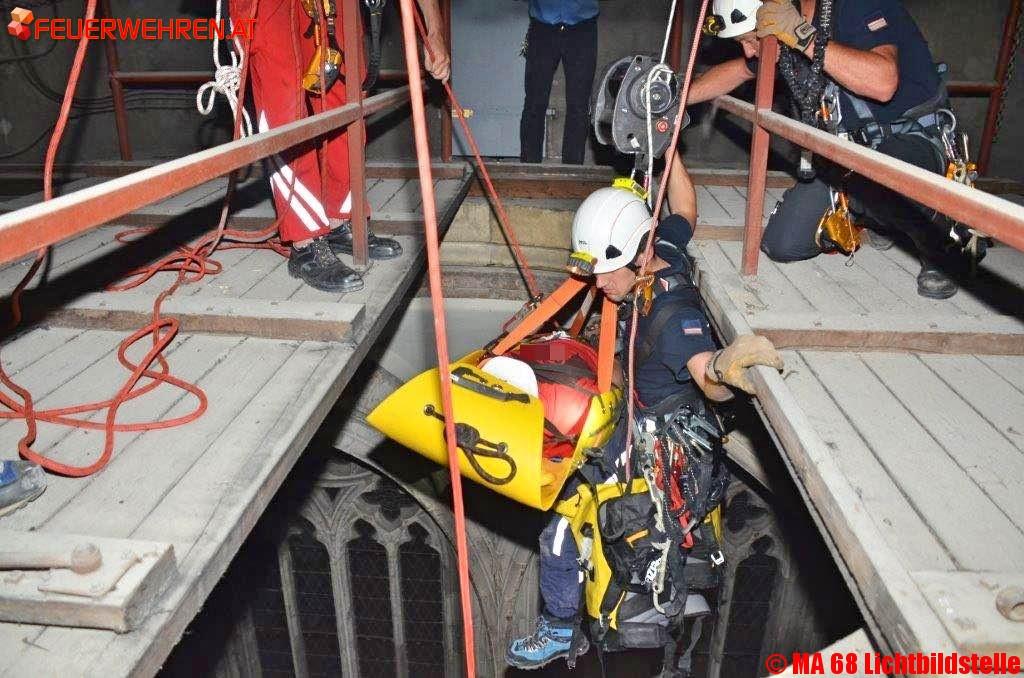 Von der Höhenrettungsgruppe der Berufsfeuerwehr Wien wurde der Besucher für den Transport vorbereitet und unter Begleitung eines, als Höhenretter ausgebildeten Feuerwehrbeamten über eine vorhandene Öffnung innerhalb des Turmes ca. 70 Meter abgeseilt. Bedingt durch die baulichen Gegebenheiten und Hindernisse war ein direktes Abseilen nicht möglich. Während des Abseilvorganges waren laufend begleitende Maßnahmen, wie das aussteuern der Rolltrage durch die Höhenrettungsgruppe, notwendig.