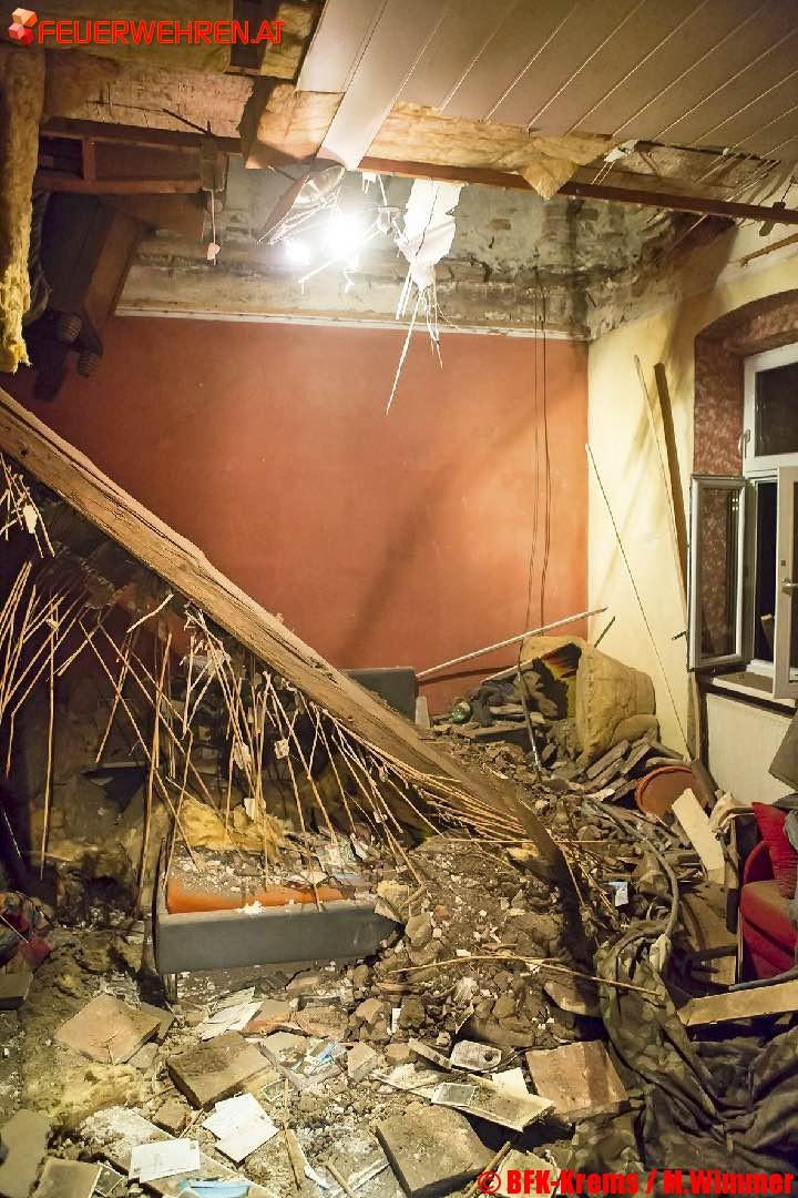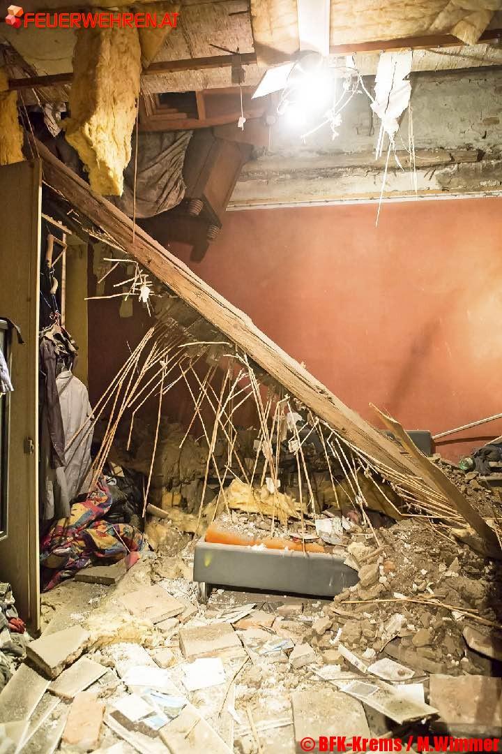 Aus noch unbekannter Ursache gab die Holztramdecke des Gebäudes nach und stürzte in das daruntergelegene Schlafzimmer des Hauses. Eine Person, welche im Bett lag wurde von den Trümmern verschüttet. Sofort nach Eintreffen der Feuerwehrkräfte wurden die Trümmerteile händisch entfernt, um den Mann befreien zu können. Mittels Schaufeltrage wurde die Person schonend unter der Tramdecke hervorgezogen und mit Verletzungen unbestimmten Grades dem anwesenden Notarztteam übergeben.
