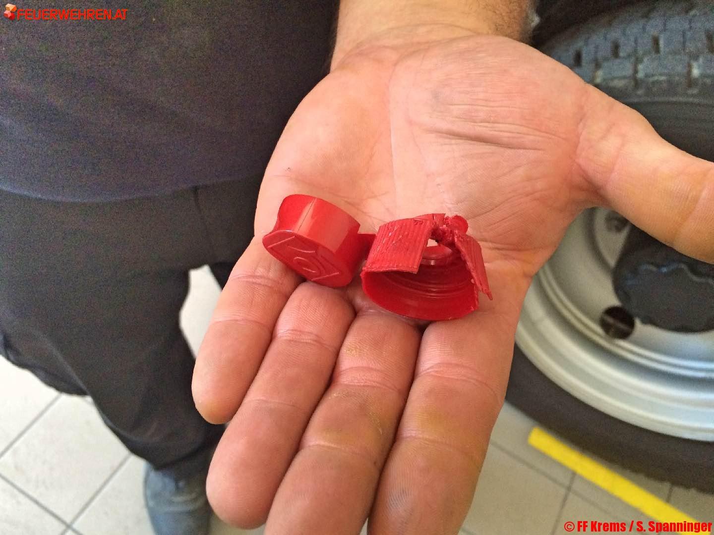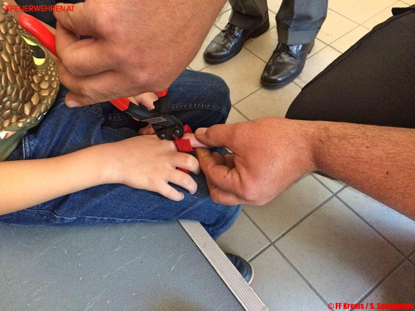 Unerwarteten Besuch erhielt die Feuerwehr Krems am Nachmittag des 5. Juli 2016. Beim Versuch, einen Strohhalm einer Trinkflasche zurückzuholen, blieb ein 7-jähriger Bub mit seinem Zeigefinger im Verschluss dieser stecken. Befreiungsversuche durch den Großvater scheiterten, weshalb die Feuerwehr aufgesucht wurde.