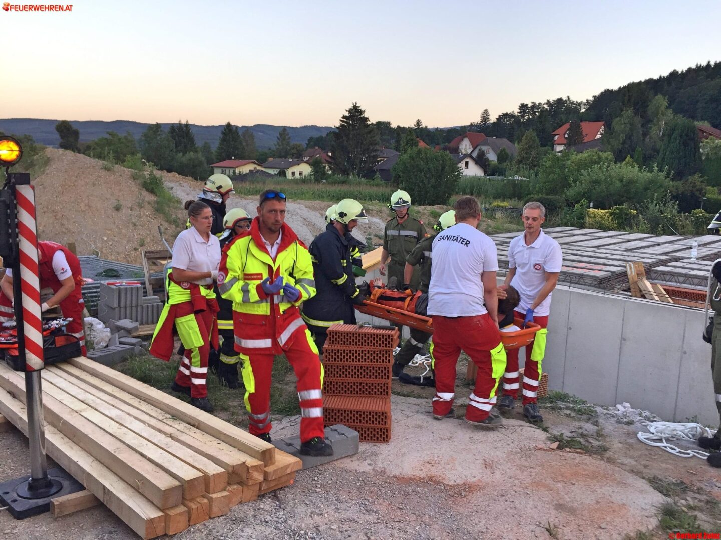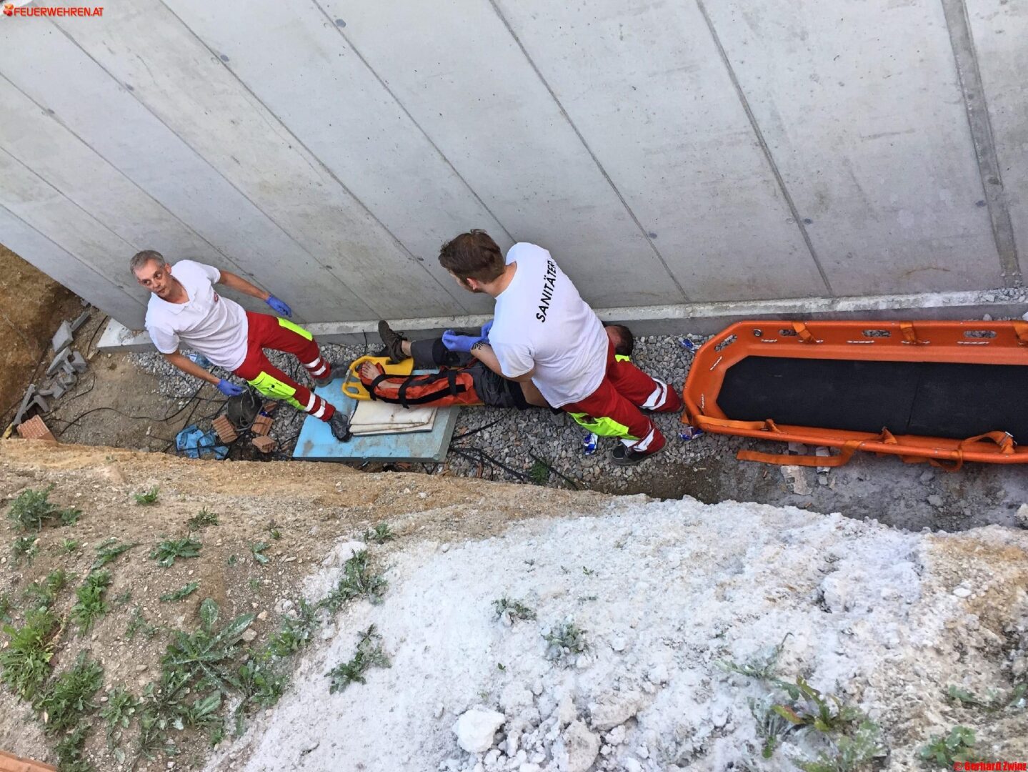 In den Abendstunden des 31.07.2017 kam es in Ternitz-Pottschach zu einem Unfall auf einer Baustelle. Ein 47 jähriger Mann ist in eine 2,5m tiefe Baugrube gestürzt und hat sich eine schwere Fußverletzung zugezogen.