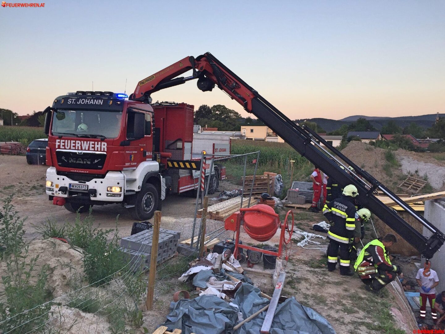 Der alarmierte ASBÖ forderte zur Rettung der verletzten Person die Feuerwehr an. Die FF Ternitz-Pottschach und Ternitz-St.Johann wurden laut Alarmplan zur Unfallstelle gerufen. Nach dem Eintreffen an der Einsatzstelle, wurde vom Einsatzleiter der Feuerwehr Pottschach (Peter Reumüller, BI) gemeinsam mit dem Rettungsdienst entschieden, die verunfallte Person mittels Kran aus der Grube zu heben. Der Mann wurde nach der Erstversorgung und Stabilisierung des Fußes mittels Kran von der Feuerwehr St.Johann herausgehoben.