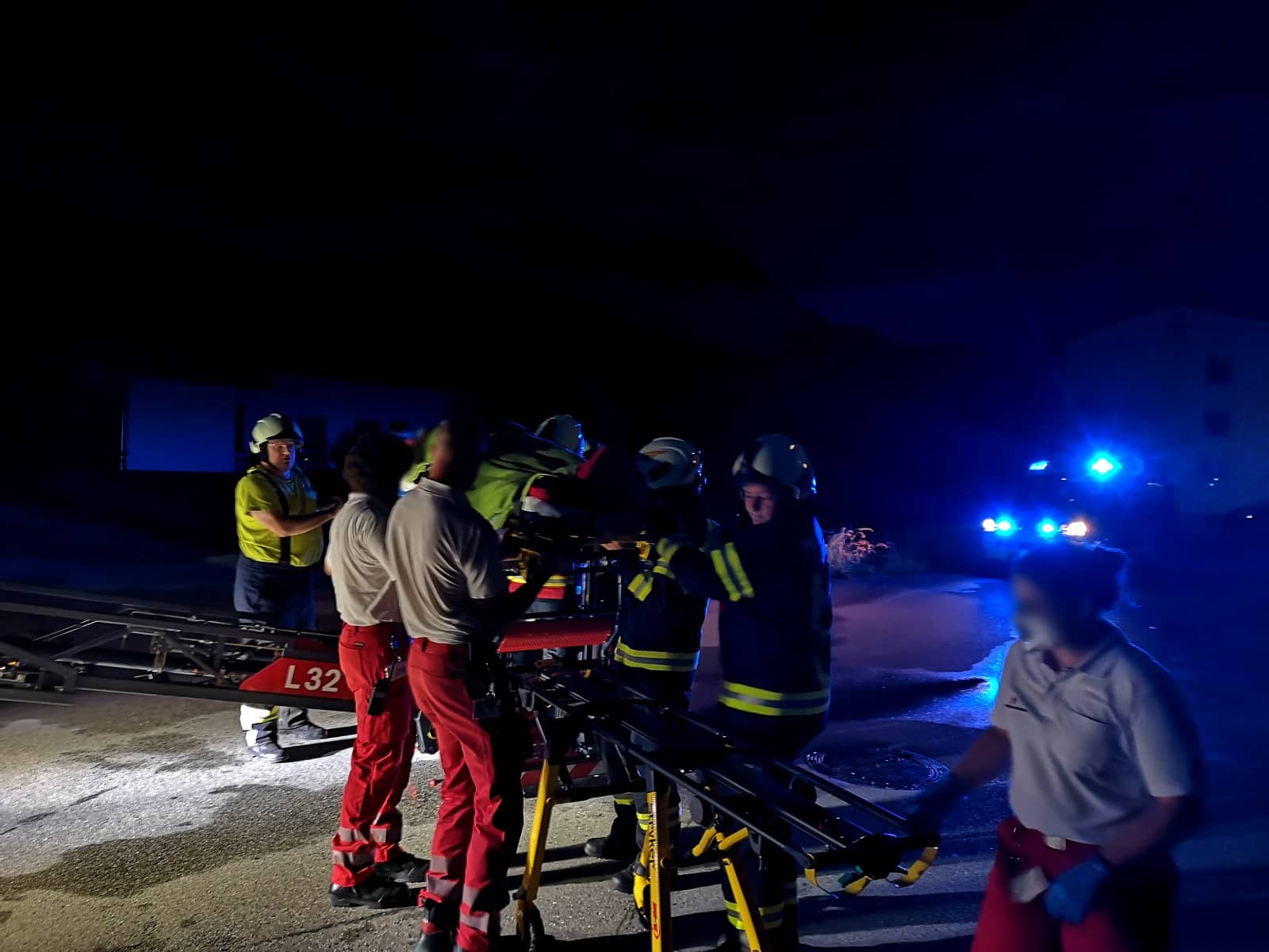 Eine Person musste liegend zum Sanitätseinsatzwagen transportiert werden. Aufgrund der engen Verhältnisse im Stiegenhaus war dies aber nur über die Drehleiter möglich. Umgehend brachten die Einsatzkräfte der Feuerwehr die Drehleiter in Stellung und konnten so die Personenrettung durchführen.