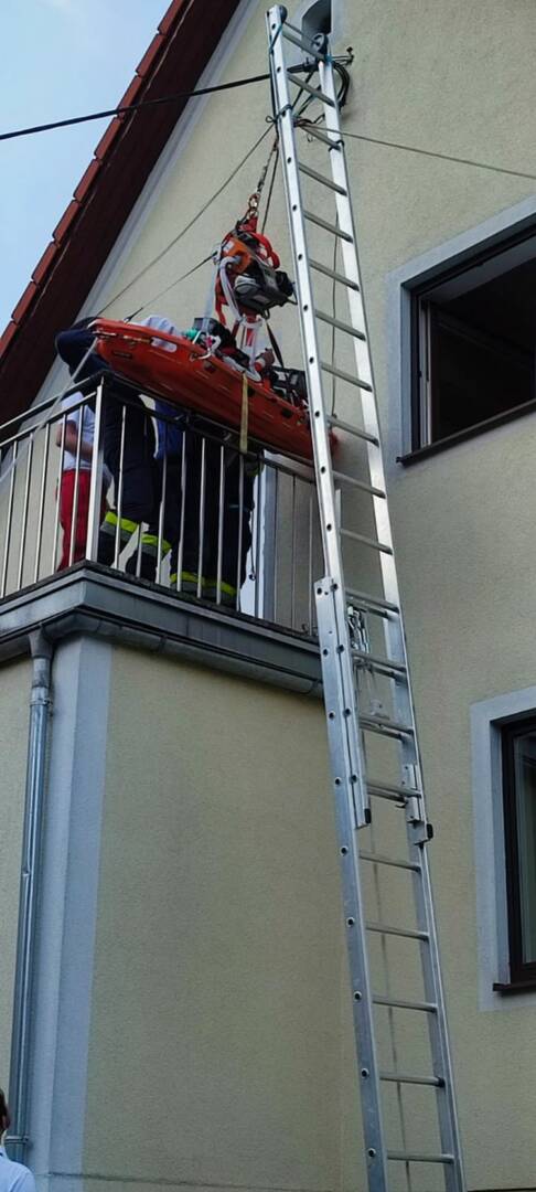 Mittels Korbtrage konnten wir die Person aus dem 1. Obergeschoß abseilen und dem Roten Kreuz übergeben. Dieses transportierte die Person ins LKH Bruck.