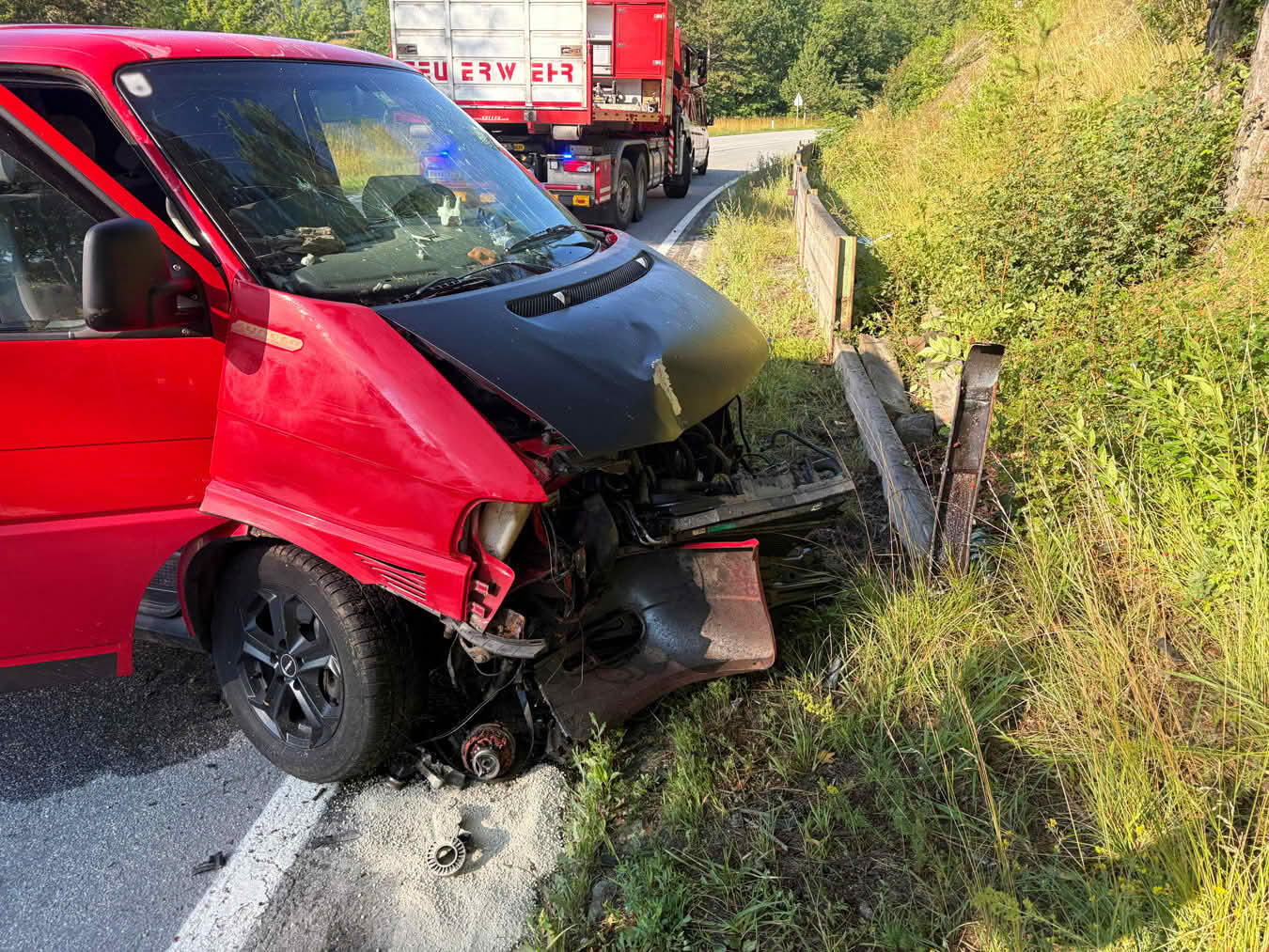 In unmittelbarer Nähe vom Feuerwehrhaus Groisbach (Gemeinde Alland) ereignete sich am Samstag (19.07.2025) ein Verkehrsunfall, wobei ein VW-Transporter aus unbekannter Ursache gegen eine Schutz-Planke prallte und quer auf der Fahrbahn der LB11 zum Stillstand kam.
