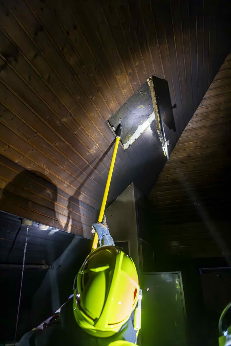 Mit Einreißhaken öffneten die Einsatzkräfte unter Atemschutz die Dachverkleidung und kontrollierten den Zwischenbereich auf Glutnester oder bestehendes Feuer. Mithilfe einer Wärmebildkamera wurde der gesamte betroffene Bereich überprüft und die Glutnester rasch abgelöscht. Die Drehleiter kontrollierte zusätzlich die Dachaußenhaut mit der Wärmebildkamera.