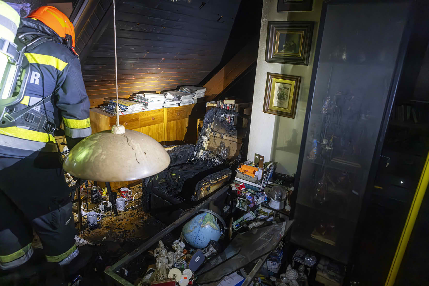 Das Feuer konnte von einem Bewohner beim Verlassen der Wohnung eingedämmt werden. Der obere Stock war stark verraucht. Die Einsatzkräfte gingen unter Atemschutz mit der ersten Löschleitung in die Brandwohnung vor. Im Wohnbereich fanden sie einen stark verbrannten Sofasessel vor. Über das Dachfenster wurde rasch eine Entlüftung geschaffen.