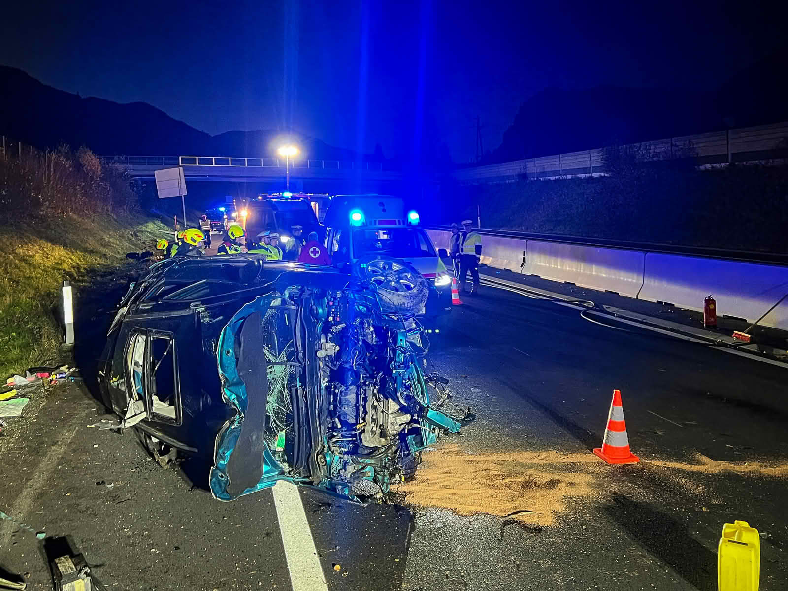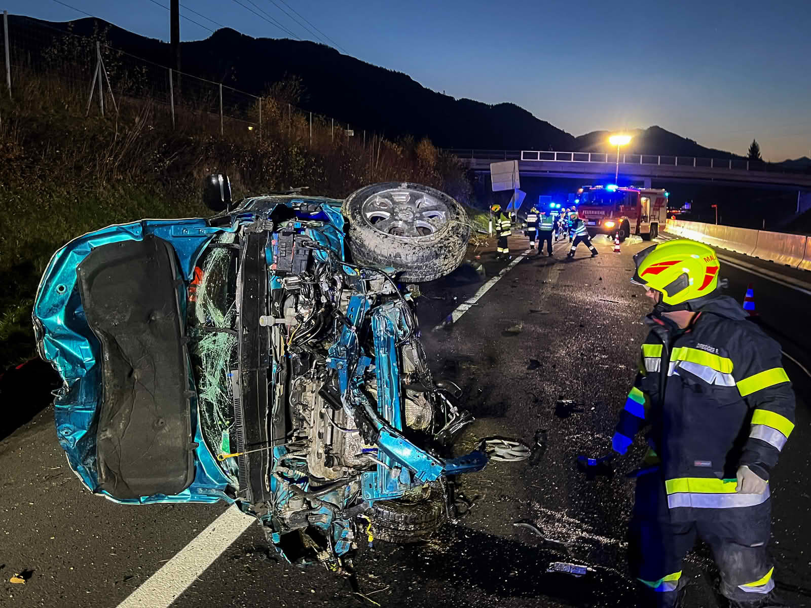 Ein mit zwei Personen besetzter Pkw war im Bereich Gaisgraben aus noch ungeklärter Ursache rechts von der Fahrbahn abgekommen, prallte gegen eine große Verkehrstafel und überschlug sich mehrmals, bevor das Fahrzeug rund 50 m weiter seitlich liegend zum Stillstand kam. Entgegen der ersten Meldung waren die beiden Insassen glücklicherweise nicht eingeklemmt und konnten sich mithilfe beherzter Ersthelfer selbst aus dem stark beschädigten Fahrzeug befreien.