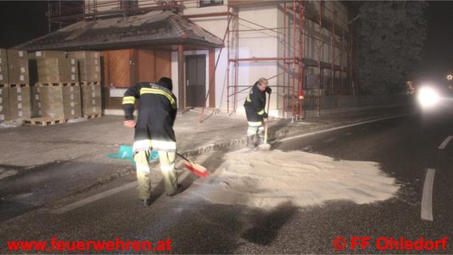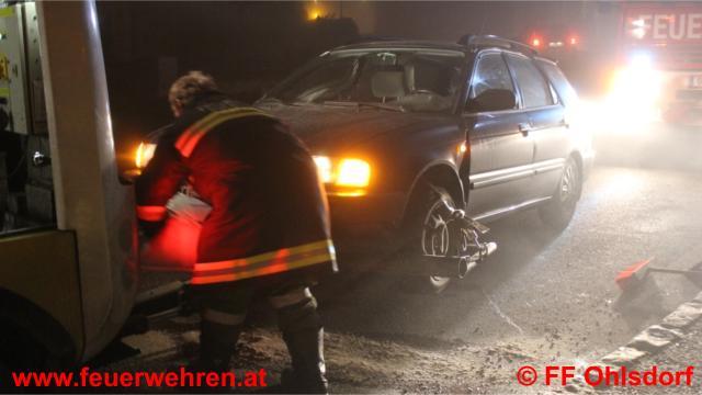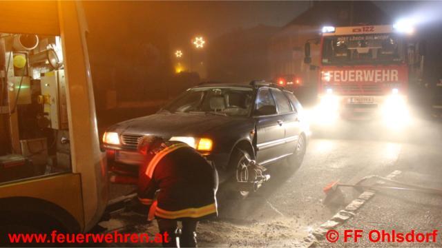 Ein Fahrzeuglenker kam am Freitag, den 25. November 2011 im Ohlsdorfer Ortszentrum von der Fahrbahn ab und krachte dabei gegen den Gehsteig. Der herbeigerufene Pannendienst alarmierte telefonisch die Feuerwehr Ohlsdorf. Da gerade eine große Anzahl an Kameraden im Gerätehaus waren, konnte ein Fahrzeug rasch zur Unfallstelle ausrücken.