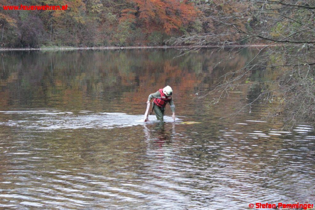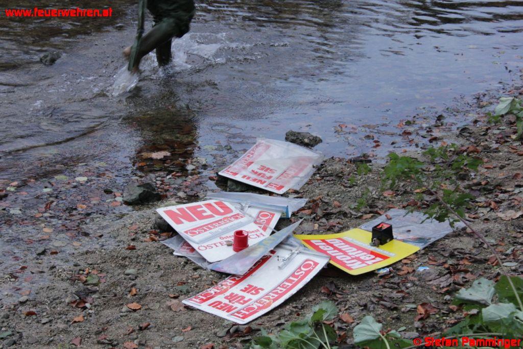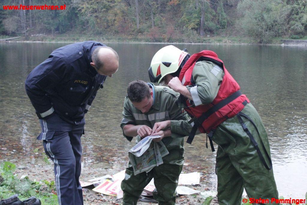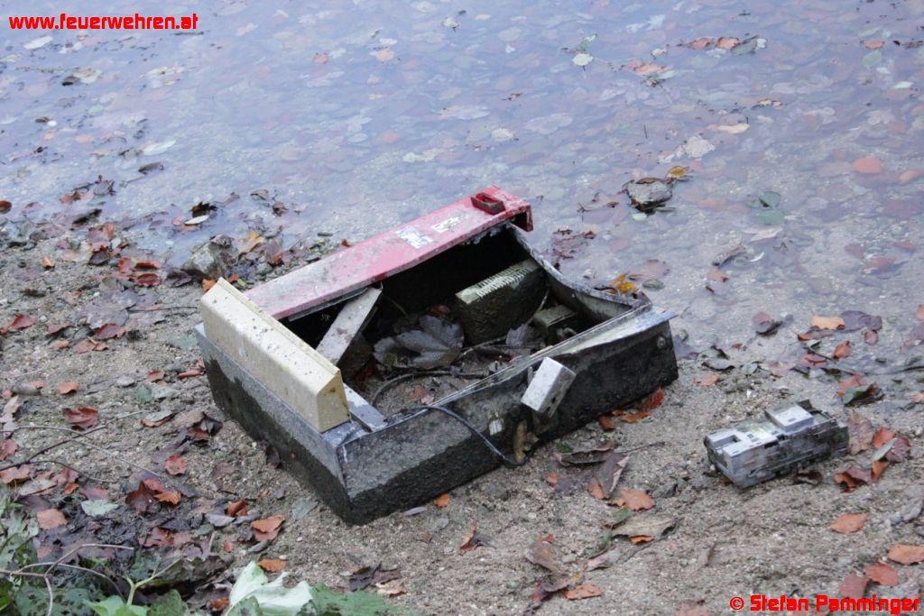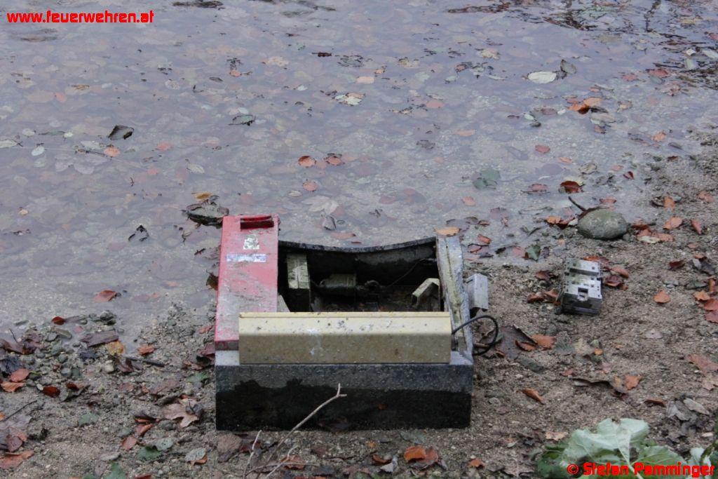 Die bereits am Einsatzort wartende Polizei Gmunden bat die Kameraden mit Hilfe der Wathose die Zeitungsständer aus der Traun zu bergen. Zwei Kameraden zogen die Wathose an und durchsuchten das seichte Ufer. Nach dem mehrere Zeitungsständer aus der zum Glück Niedrigwasser führenden Traun geborgen wurden, konnten die Beamten feststellen, dass diese bereits mehrere Tage dort verbracht haben. Die Zeitungen im Ständer brachten das Zeitungsdatum von 26. Oktober 2012 vor. Alle Ständer sowie ein am Ufer gefundener Geldwechselautomat waren aufgebrochen und leer. Nach der Bergung wurden die Sachen zur Polizei nach Gmunden gebracht, welche nun weitere Ermittlungen durchführen wird.