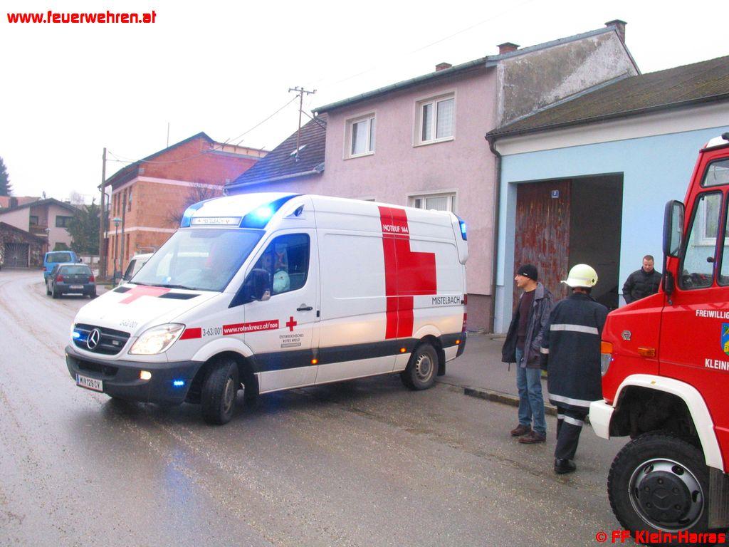Durch einen verlegten Kamin kam es zu einer Kohlenmonoxidausbreitung in die Wohnräume! Die beiden Bewohner konnten durch die Rettung ins Freie gebracht werden und wurden zur Beobachtung ins Landesklinikum nach Mistelbach eingeliefert! Die Freiwillige Feuerwehr Klein-Harras öffnete unter schwerem Atemschutz zur Belüftung der Räume alle Fenster und kontrollierte den Keller sowie den Heizungsofen und den Rauchfang.