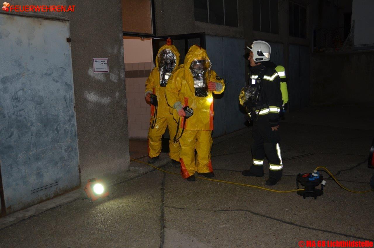 Von der Berufsfeuerwehr Wien wurden diverse Messungen in Chemikalienschutzanzügen durchgeführt und im Umweltmessfahrzeug von einem Feuerwehr-Chemiker ausgewertet.