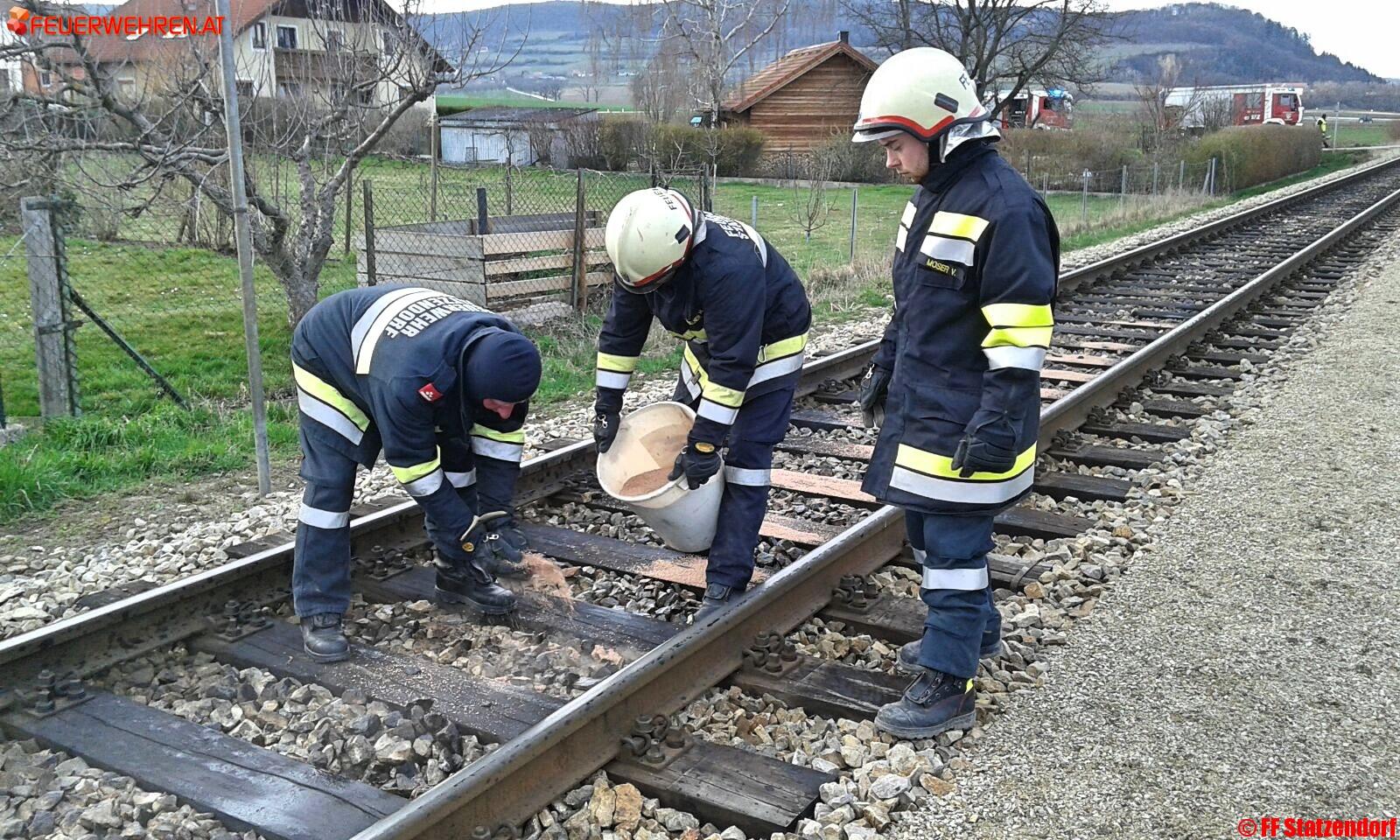 Die Mitarbeiter der ÖBB wiesen die Statzendorfer Einsatzkräfte ein, diese setzten sofort Erstmaßnahmen. Des Weiteren wurde Bindemittel auf die Schadstelle aufgebracht. Nach rund zwei Stunden konnte man wieder ins Feuerwehrhaus einrücken.