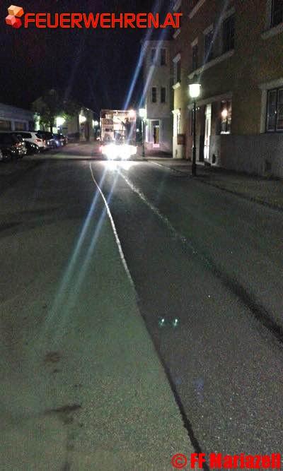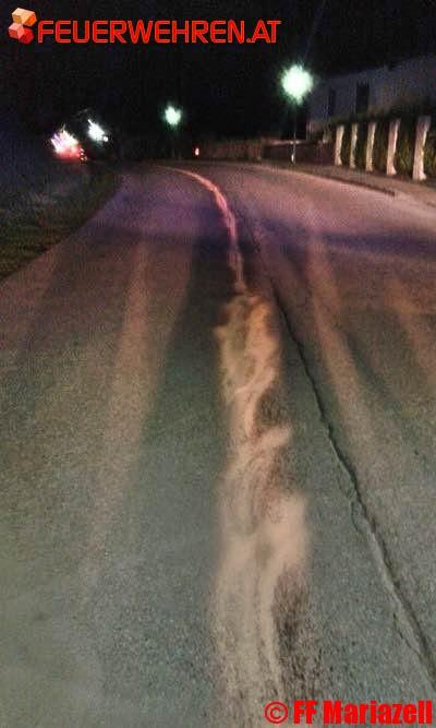 Eine aufmerksame Zivilperson (selbst bei der Feuerwehr) hat die Ölspur um 23:40 Uhr entdeckt und seine Kameraden alarmiert. Die FF-Mariazell rückte mit 10 Mann und den Fahrzeugen; KRF-S, VF, LKW-A mit Ölcountainer zum Einsatzort aus. Mit Ölbindemittel wurde erst die schwerwiegendere starke Ölspur – von der Wienerstraße bis zum Kreuzberg – gebunden. Für die weitere leichte Ölspur (Tröpfchen) bis zum Lahnsattel wurde die Straßenmeisterei zur Unterstützung angefordert.