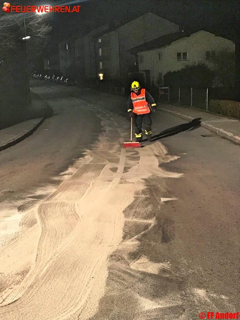 Von der Polizei wurde die Feuerwehr Andorf am Allerseelenabend gerufen. Eine massive Ölspur zog sich von der Raaberstraße ausgehend in Richtung Enzenkirchen und musste beseitigt werden.