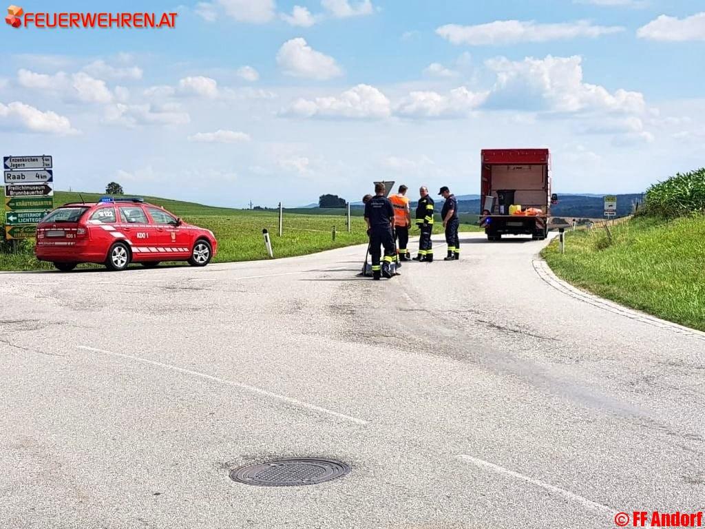 Die Aufgabe der Feuerwehr Andorf bestand darin, den fließenden Verkehr im Einsatzgebiet zu regeln, die Ölspur entsprechend zu binden und dadurch Folgeunfälle zu vermeiden.