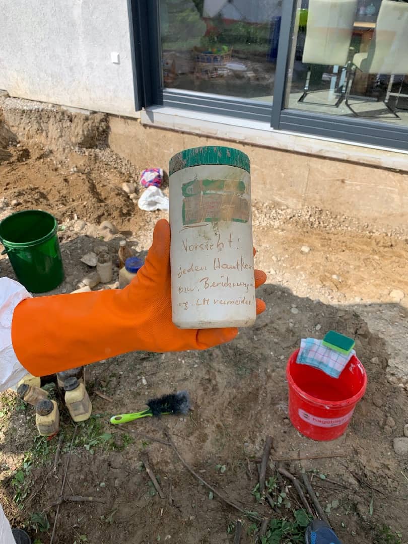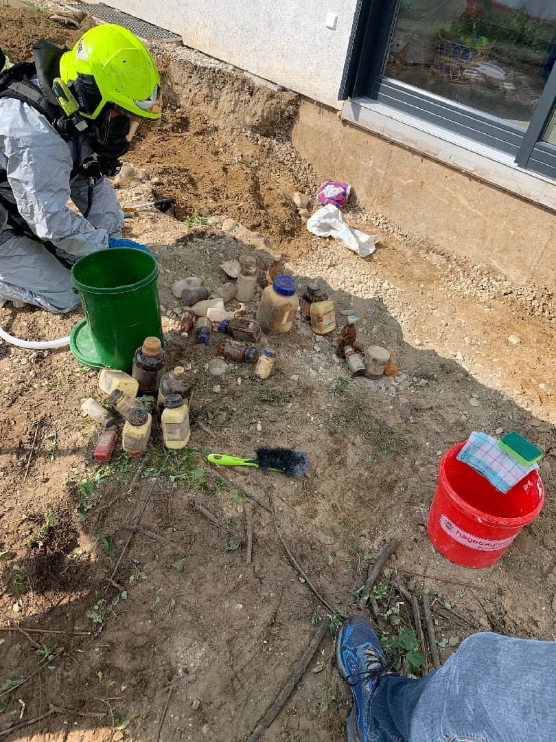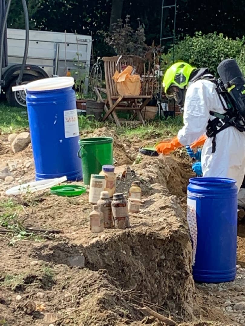 Nachdem sämtliche Chemikalien- und Giftbehälter geborgen wurden, grub ein Baggerfahrer unter Sicherung den Bereich um die Fundstelle behutsam auf um den Nahbereich auf weitere Altlasten zu untersuchen. Da keine weiteren Gefahrstoffe ans Tageslicht traten, wurden in Absprache mit dem Landeschemiker die gefundenen Gebinde in Transport- und Sicherungsbehälter der Feuerwehr verpackt und zu einem konzessionierten Entsorger gebracht. Im Anschluss wurde die Einsatzstelle und der Keller auf messbare Schadstoffe kontrolliert und freigemessen.