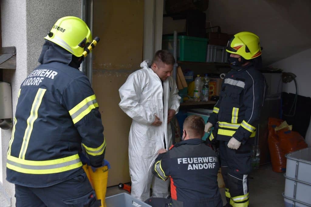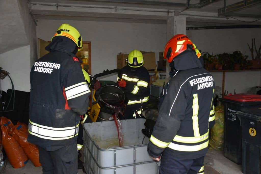 Ein entstandener Überdruck im Heizöltank führte zu einem Ölsaustritt über den Einfüllstutzen des Öltanks, was zu einem großen Ölteppich im Tankraum führte. Die eingetroffene Einsatzmannschaft der Feuerwehr Andorf begann unmittelbar mit dem Absaugen des ausgelaufenen Heizmittels und verhinderte eine weitere Ausbreitung mit großflächigem Aufbringen von Ölbindemittel und Ölbindevlies.