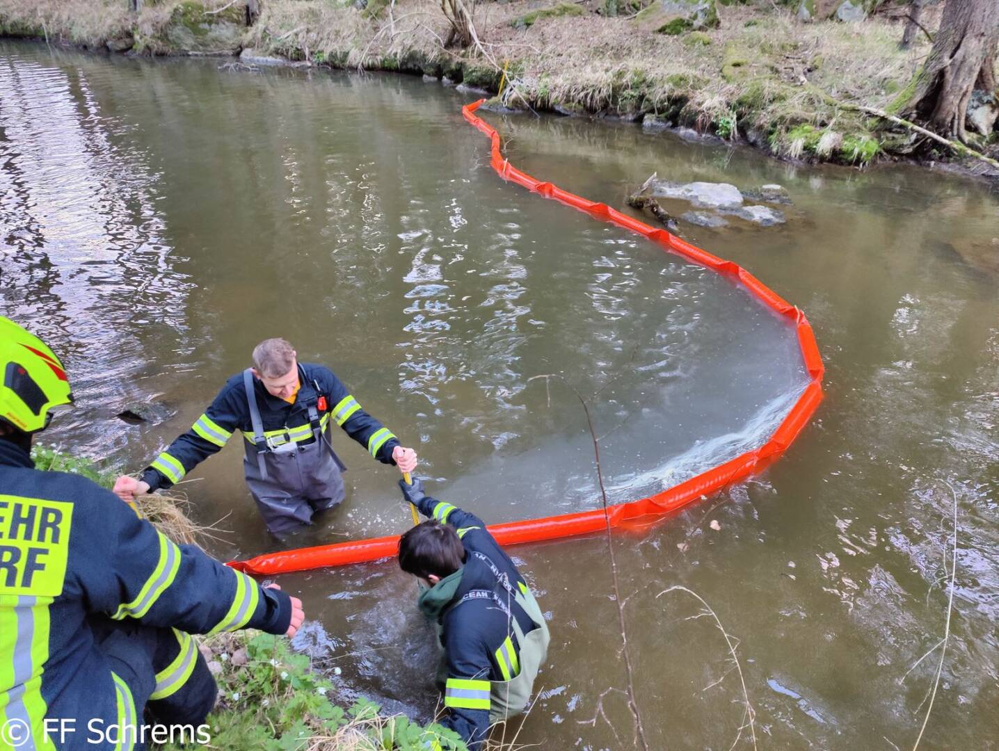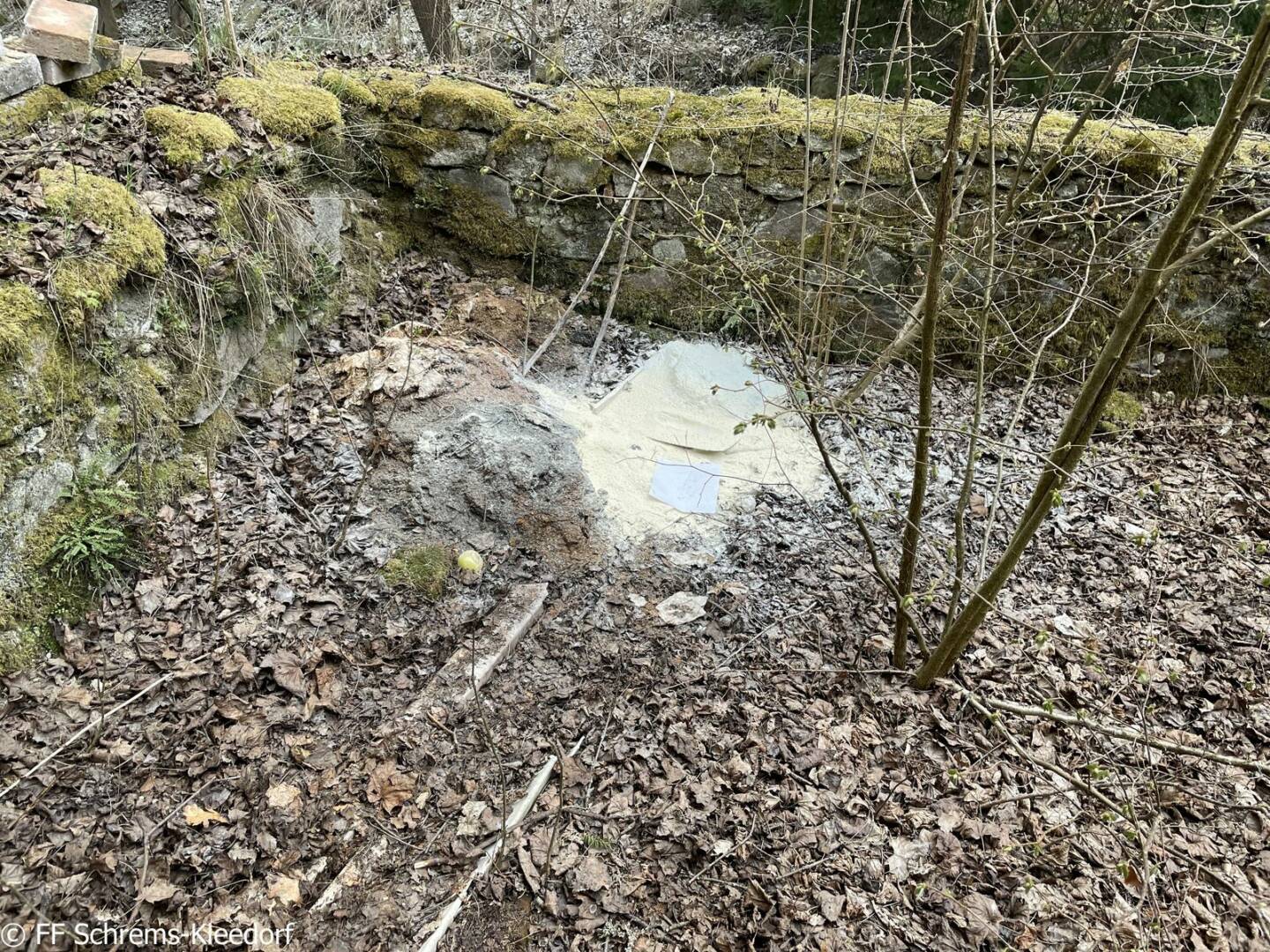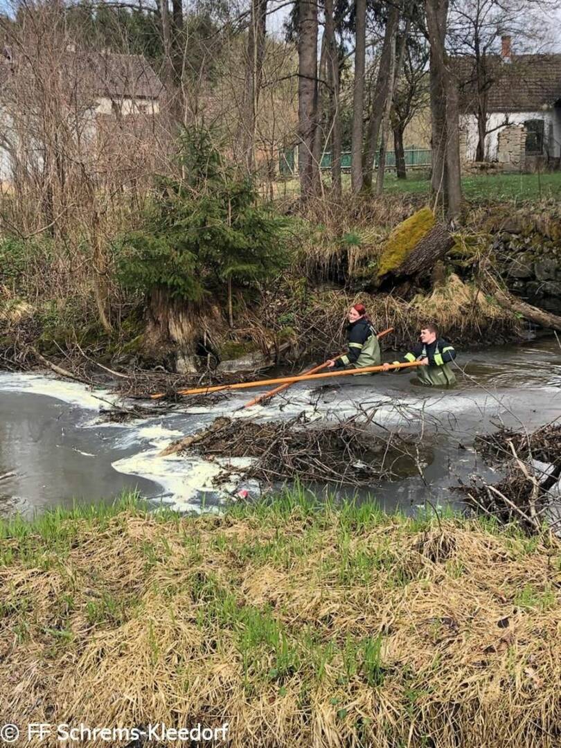 Im Zuge zweier schweißtreibender Einsätze verhinderten die Feuerwehren aus Kleedorf, Hoheneich, Stadt Schrems und Stadt Gmünd eine Umweltgefährdung des Braunaubaches zwischen der „Anderlfabrik“ und der Hoheneicher Heweg Wehr. Bereits am Ostermontag wurden rund 50 Floriani zur Anderlfabrik gerufen, da Passanten dort ein vorerst unbekanntes, weißes Medium im Bach und an der Uferböschung entdeckten und die Einsatzkräfte alarmierten.