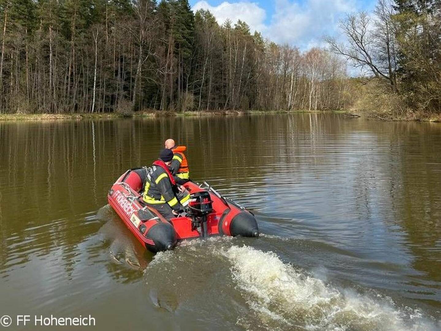 Während sich die Mitglieder der Feuerwehren Kleedorf und Stadt Schrems vom Ausgangspunkt der Verunreinigung talwärts vorarbeiteten um das Löschpulver Meter für Meter von der Böschung zu spülen und es in den eingesetzten Ölsperren abzuschöpfen, kontrollierten die Frauen und Männer der Feuerwehren Hoheneich und Stadt Gmünd laufend den Bachverlauf mit einem Feuerwehrboot auf weitere Verunreinigungen.