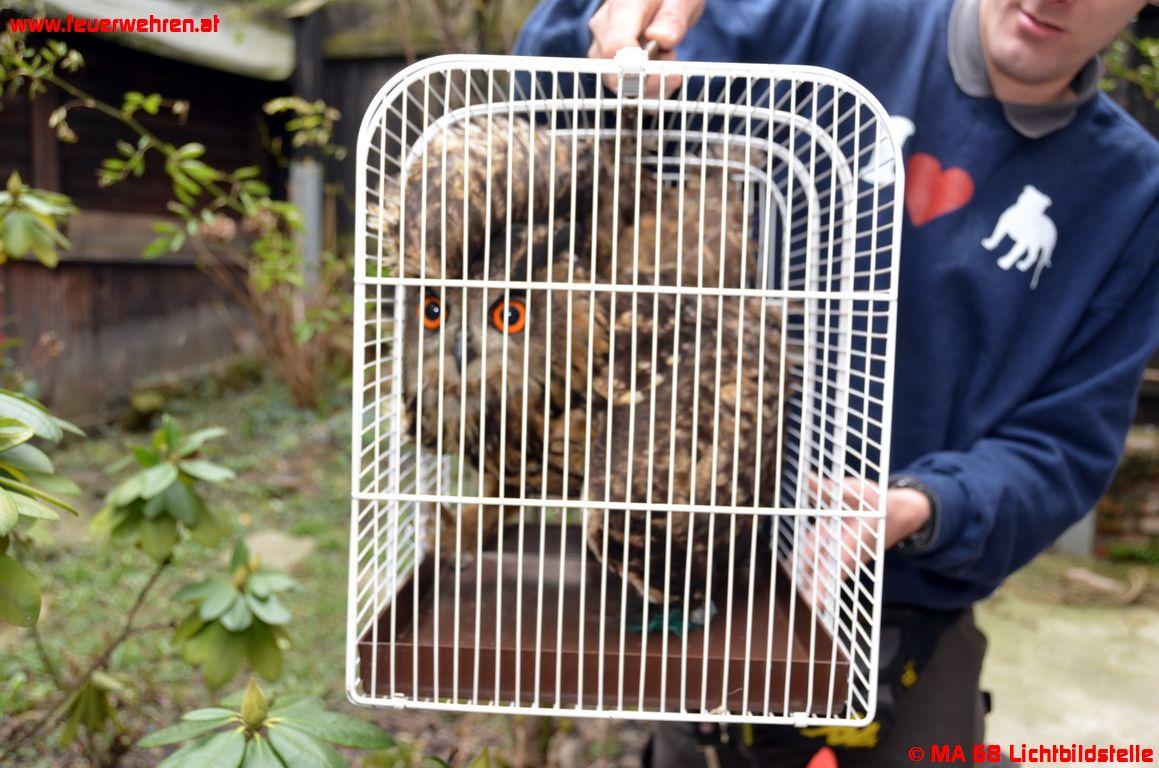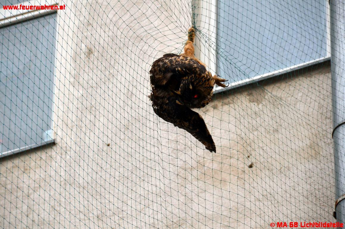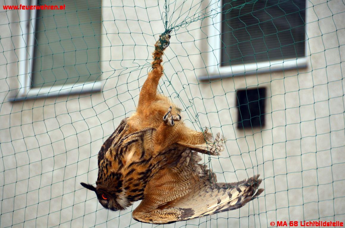In den Mittagsstunden wurde von aufmerksamen Anrainern bemerkt, dass sich ein Uhu in einem Taubenabwehrnetz in ca. 15m Höhe verfangen hatte und kopfüber zu Boden hing. Den erstalarmierten Feuerwehrkräften wurde beim Erkunden der Lage sofort bewusst, dass der Uhu in dieser exponierten Lage nicht mit einer Leiter gerettet werden konnte.