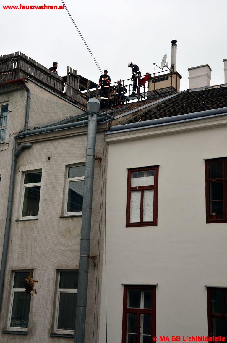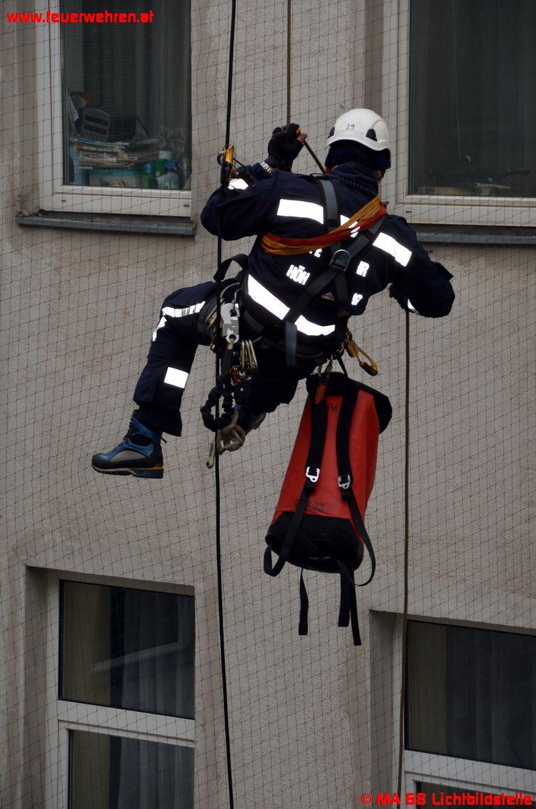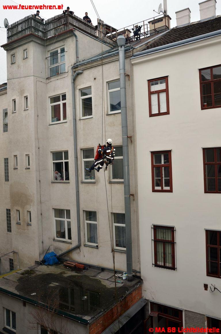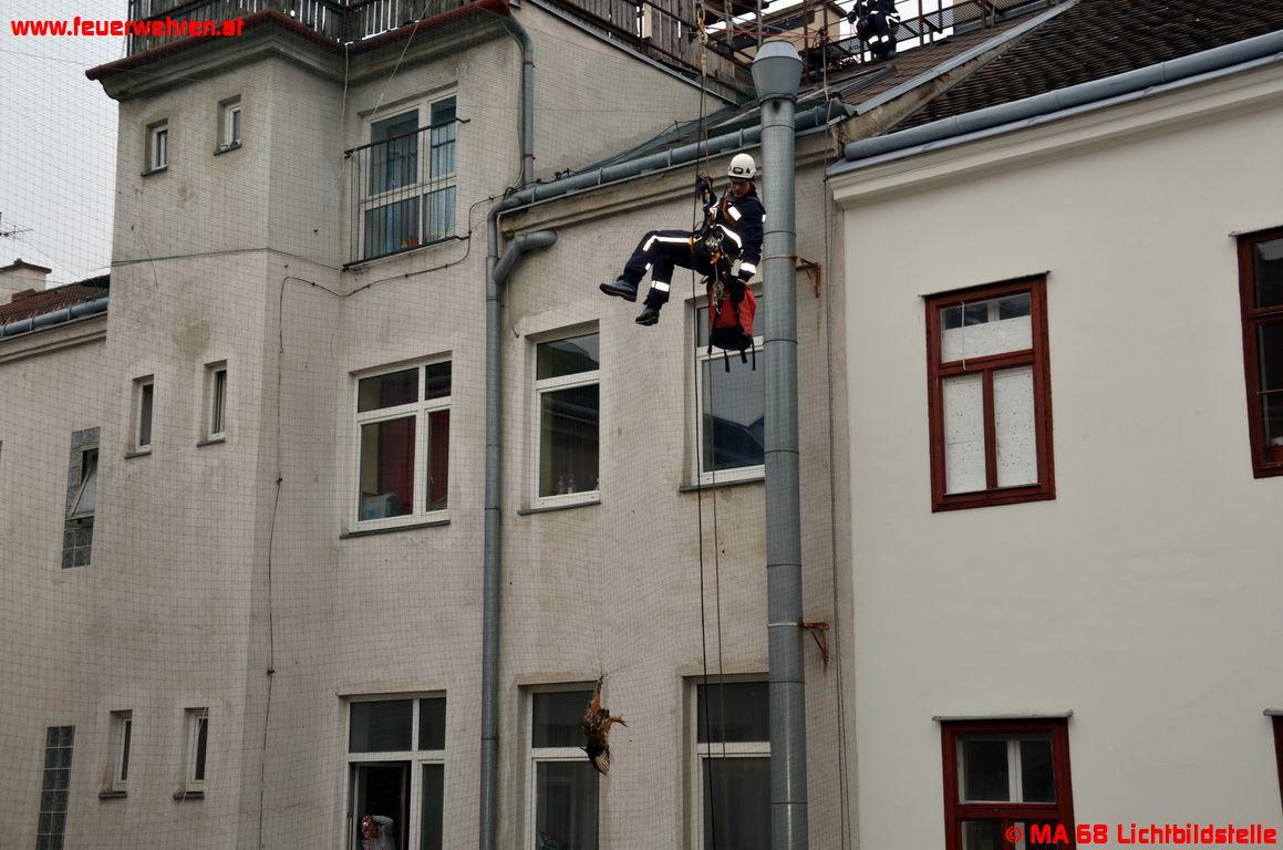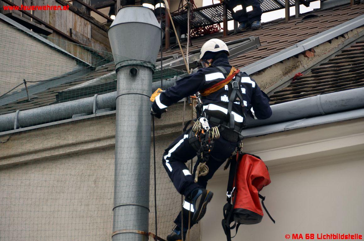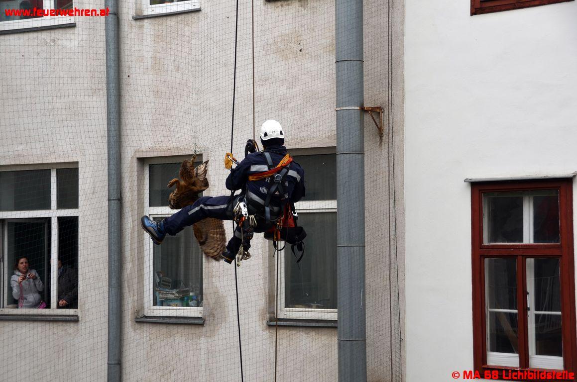 Für Einsätze in besonderen Höhen oder Tiefen hat die Berufsfeuerwehr Wien eine eigene geschulte und ausgerüstete Truppe – die Höhenretter. Von dieser Spezialeinheit wurde eine Schrägseilbergung durchgeführt. Dazu wurden zwei Seile von Dach zu Dach über den Innenhof gespannt, von denen sich nun ein Höhenretter zum Vogel abseilte. Nachdem der Eule zum Schutz ein Leinenbeutel übergezogen wurde, wurde die Kralle durch Zerschneiden des Netzes befreit. Nachdem sich der Höhenretter mit der Eule zu Boden seilte, konnte diese der Tierrettung übergeben werden.