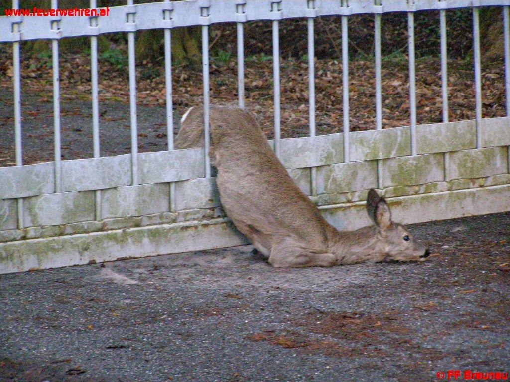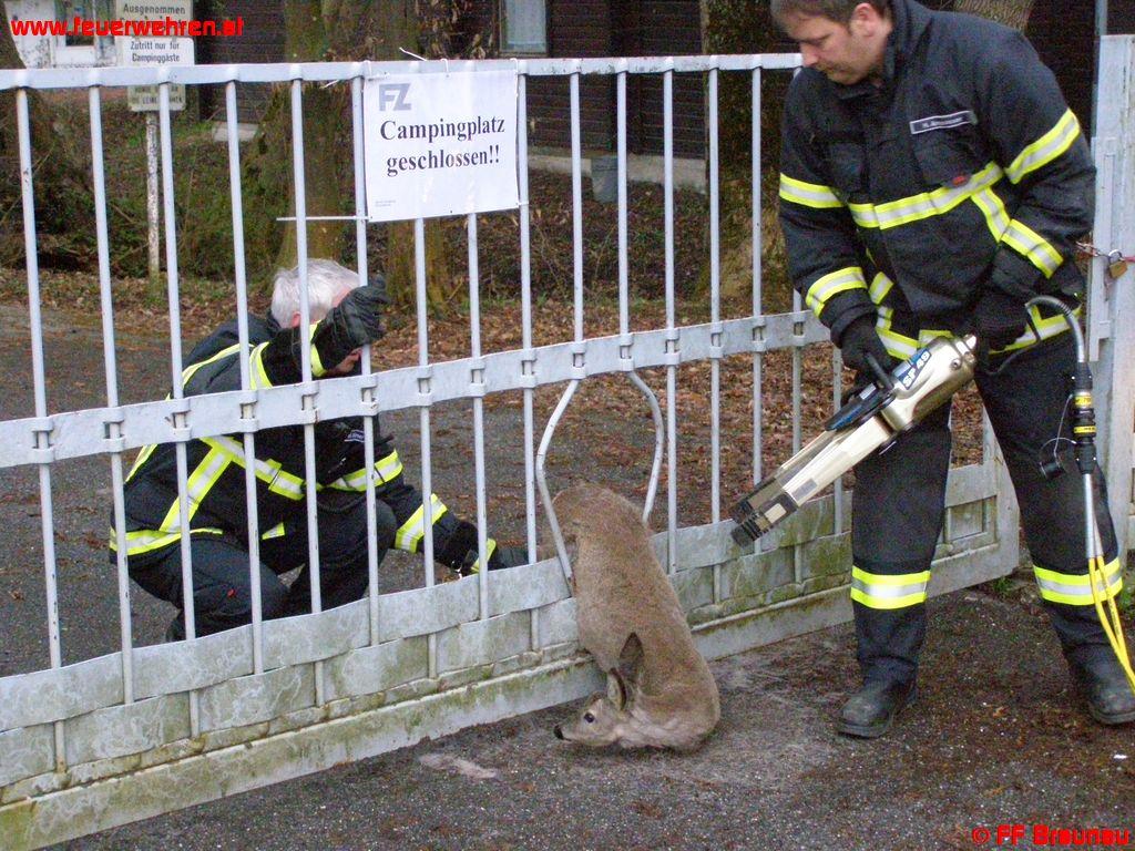 Zu einer Tierrettung beim ehemaligen Campingplatz wurde die FF Braunau mittels Kleinalarm alarmiert. Ein Reh blieb beim Versuch sich durch das Einfahrtstor zu zwängen zwischen den Gitterstäben stecken.