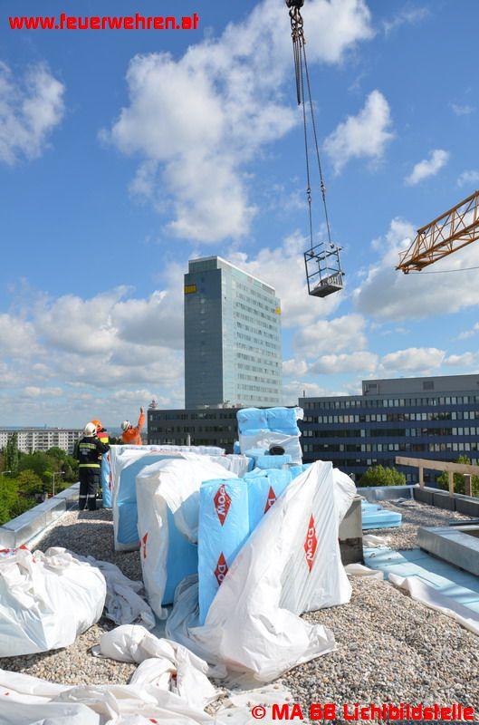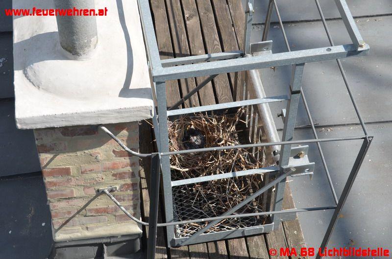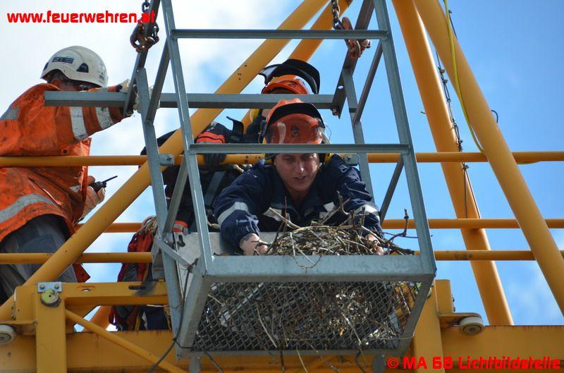 Die nachalarmierten Höhenretter entwickelten mit der anwesenden Kran- bzw. Baufirma einen Plan, wie die Tiere möglichst schonend geborgen werden können. Man entschied sich schließlich dazu, jenen Gitterrost, auf dem sich das Nest mit den Jungtieren befindet, zu demontieren und es anschließend mit dem Nest mittels eines zweiten (für den Abbau bereits vor Ort befindlichen) Krans auf dem Dach eines benachbarten Hauses wieder abzusetzen.