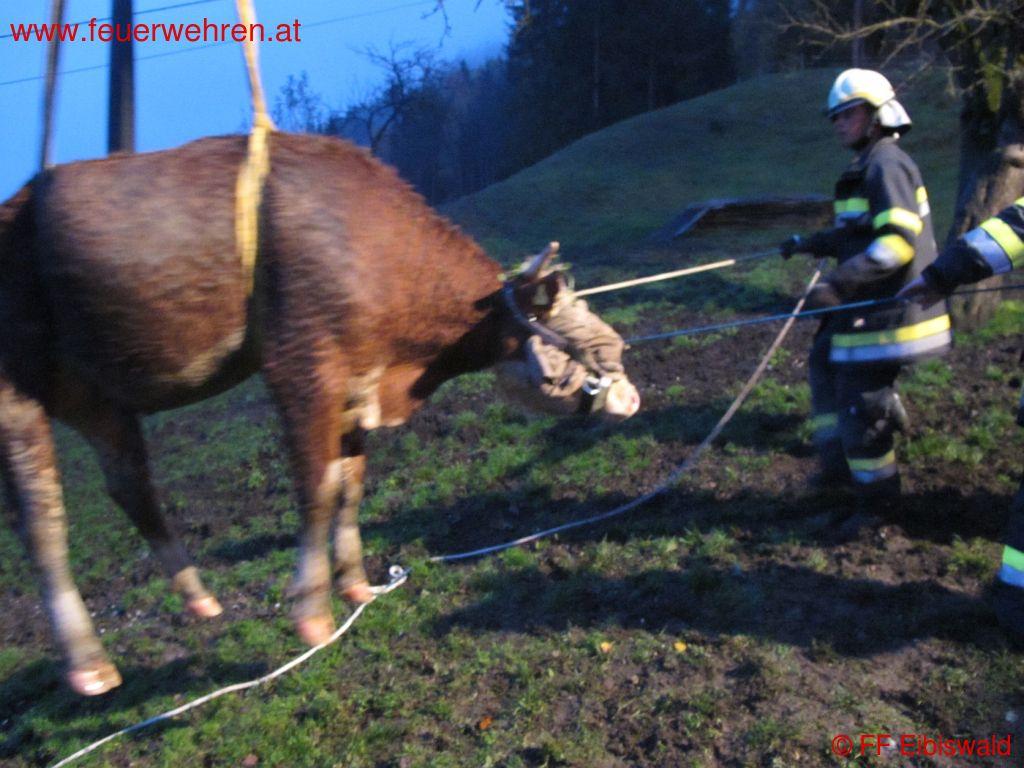 Kurz vor sechs Uhr morgens wurden die Eibiswalder Kameraden nach Rothwein gerufen. Eine trächtige Kuh war in eine Güllegrube gefallen und konnte sich nicht mehr befreien. Als die Feuerwehrkameraden am Einsatzort eintrafen wurde die Kuh zunächst von einem Tierarzt mit einem Beruhigungsmittel ruhig gestellt. In weiterer Folge konnte die Kuh mit dem Ladekran des schweren Rüstfahrzeuges aus der Grube gehoben werden. Kurz nach der Rettung brachte die Kuh das Kalb auf die Welt, beide sind wohlauf.