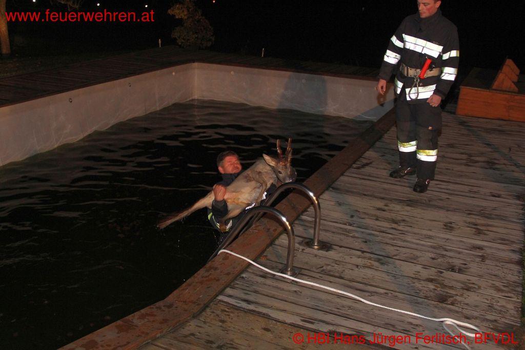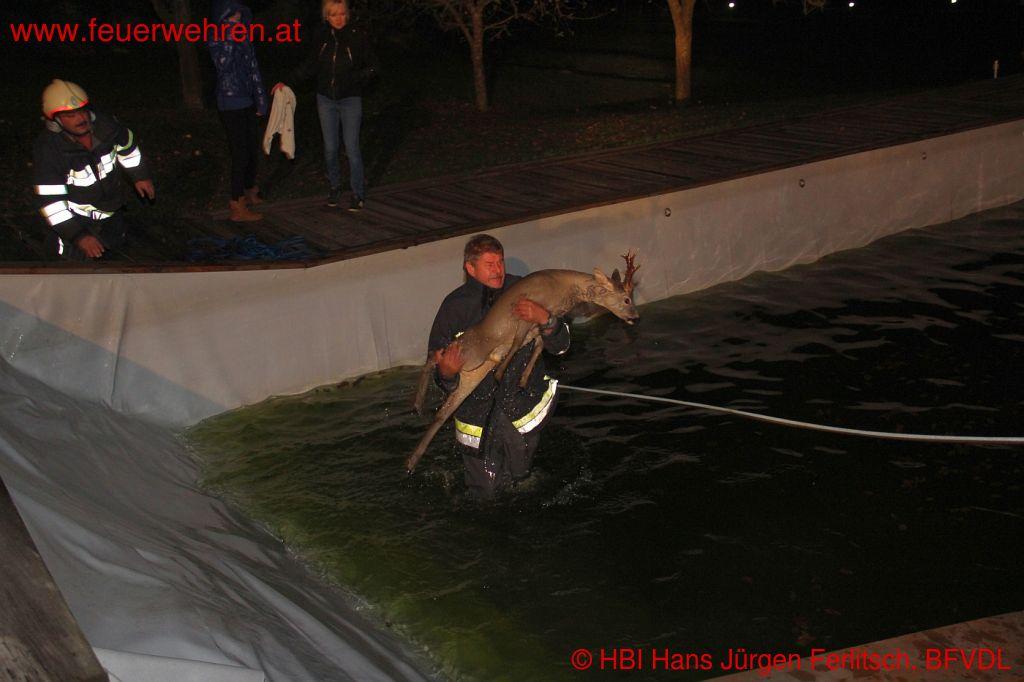 Kurz nach 17.00 Uhr erfolgte wieder die Alarmierung zu einer Tierrettung. Diesmal galt es ein Reh, das in Stammeregg in einen Pool gefallen war, zu retten. Ein Kamerad, selbst Jäger und im Umgang mit Wildtieren versiert, stieg durch eine Leine gesichert in das Becken und konnte es aus diesem befreien. Sekunden nach der Rettung suchte das glücklicherweise unverletzte Tier das Weite.