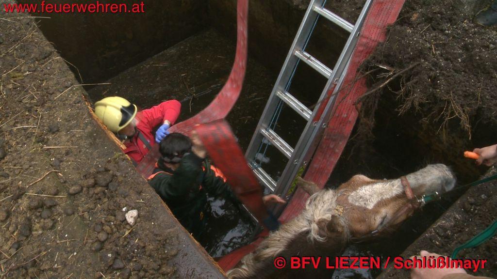 Ein junger Hengst war an einem bäuerlichen Anwesen durch Pfosten, welche eine Jauchengrube abdeckten, eingebrochen und stürzte in die rund 3 Meter tiefe Jauchengrube.