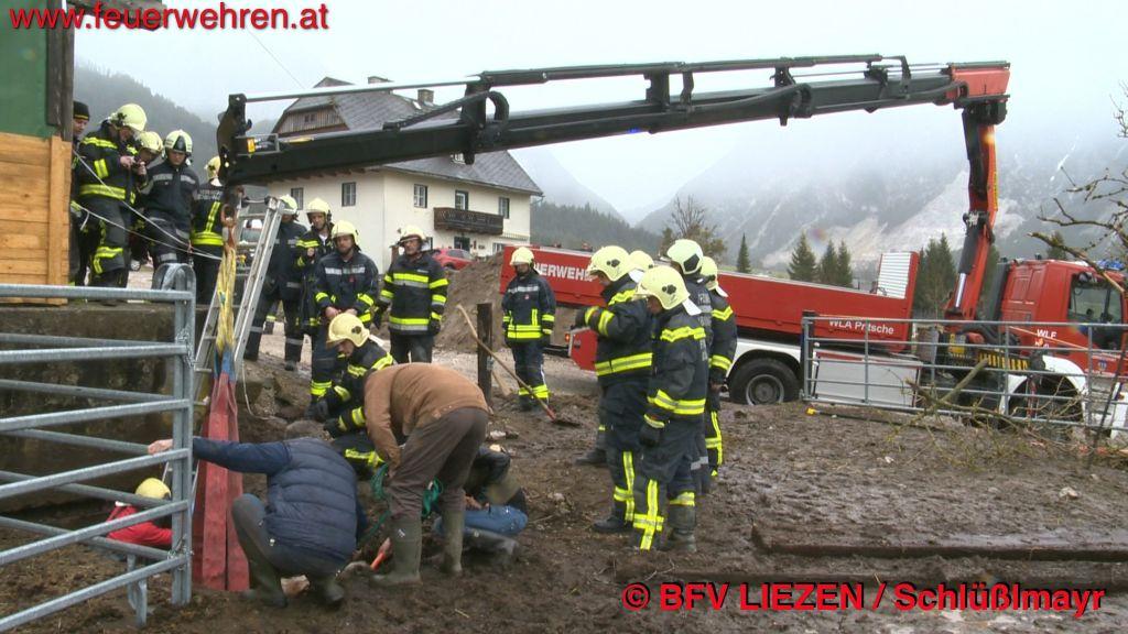 Die Feuerwehren stiegen mit einer Leiter zum verunglückten Tier hinab und befestigten hinter dem Vorderläufen sowie vorder den Hinterläufen breite Bandschlingen zur schonenden Bergung. Anschließend wurde der mittlerweile völlig entkräftete Junghengst – quasi in letzter Minute – mittels Kran des Wechselladerfahrzeuges der FF Gröbming geborgen. Das geschockte Tier überstand die Bergung völlig unverletzt.
