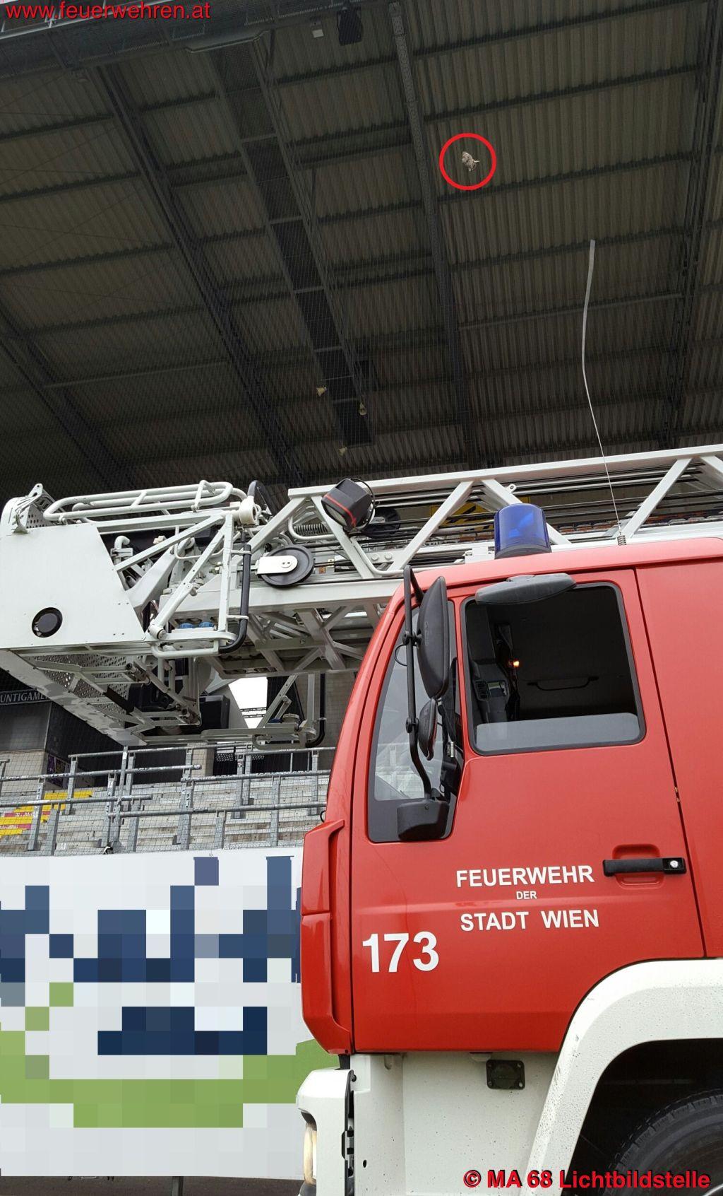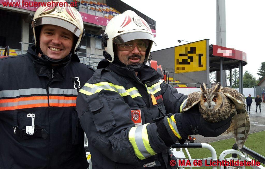 Da sich die Eule nicht mehr selbst aus ihrer misslichen Lage befreien konnte, alarmierte der Stadionmitarbeiter die Berufsfeuerwehr. Von den Feuerwehrmännern wurde nach Aufstieg über die Drehleiter der verhängte Vogel aus dem Netz gerettet.