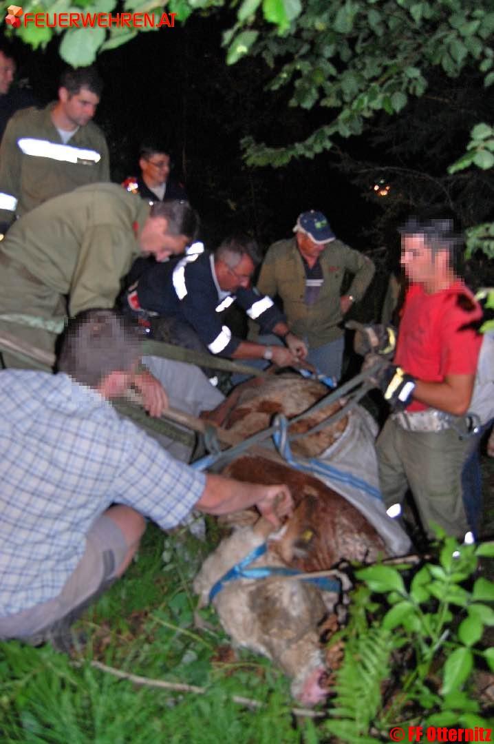 Infolgedessen wurde die FF Otternitz gegen 22.00 Uhr zu einer Tierrettung alarmiert. Beim Eintreffen der Feuerwehr, die mit 17 Mann ausgerückt war, wurde folgende Lage vorgefunden: Eine Kalbin war mitten in einem dicht bewachsenen Waldstück, in unwegsamem und sehr steilem Gelände, in einen sumpfigen Graben geraten. Dort war sie bis zum Bauch eingesunken und konnte sich nicht ohne weitere Hilfe aus ihrer misslichen Lage befreien. Herausfordernd war der aufgeweichte und feuchte Untergrund auch für die Einsatzkräfte, da kein nahes Herankommen mit Fahrzeugen an die Einsatzstelle möglich war.
