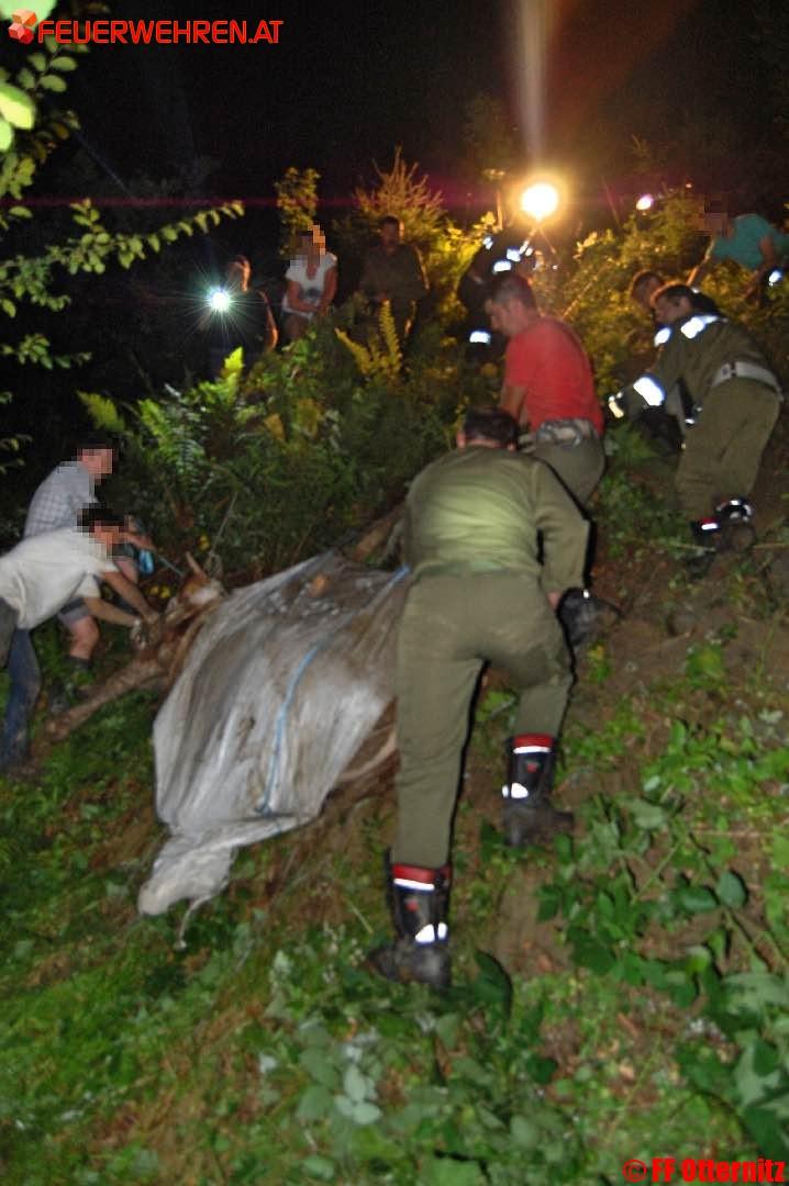 Bis zum Bauch steckte am Sonntagabend eine Kalbin fest. 17 Einsatzkräfte der FF Otternitz waren im Einsatz, um sie aus dem sumpfigen Graben zu befreien und über einen steilen Hang mit einem Gefälle von rund 100 % zu bergen.