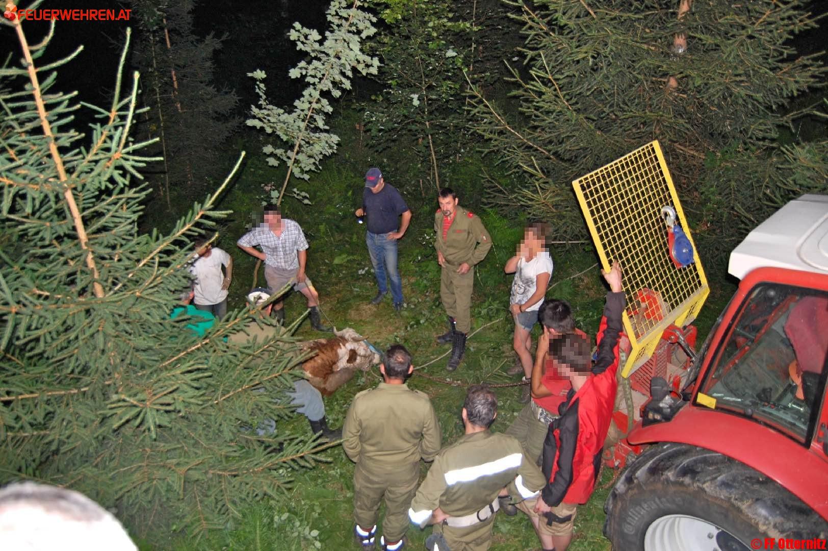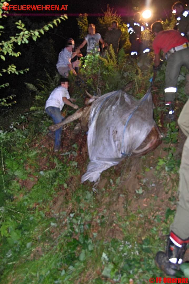 Die nächtliche Bergung aus diesem rund 25 Meter tiefen und nahezu senkrechten Graben bei rund 100 % Steigung gestaltete sich extrem schwierig. Erst mithilfe einer Traktorseilwinde, Gurten, Rundschlingen und umfunktionierten Dünger-Big-Bags gelang es mit vereinten Manneskräften, die schwer erschöpfte Kalbin aus dem Gefahrenbereich zu befreien und über den steilen Abhang hinauf zu ziehen.