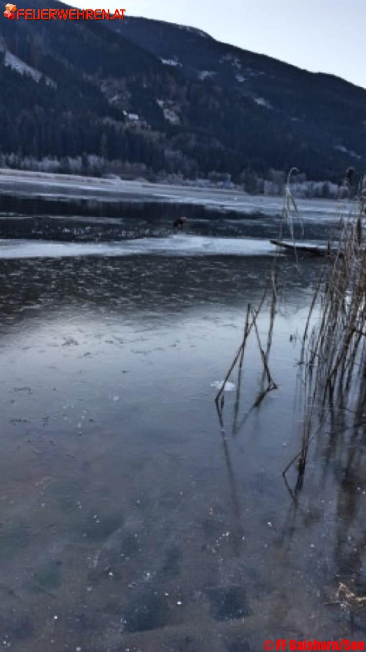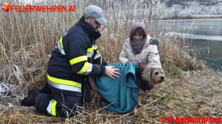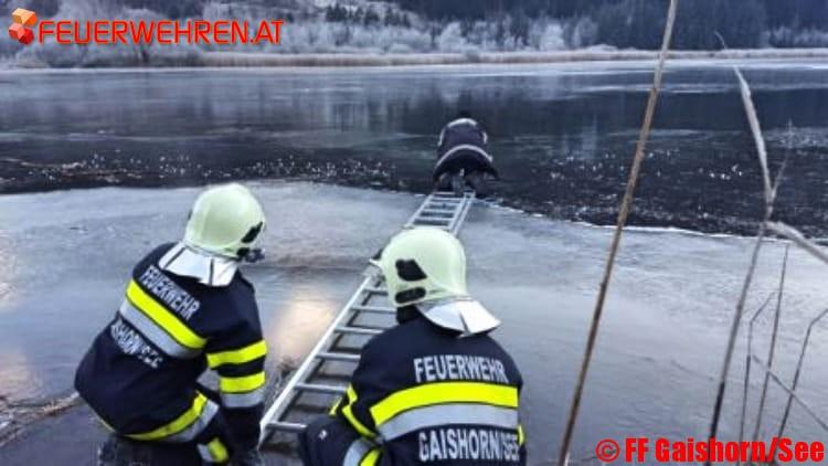 Mit der Meldung „T-08 Tierrettung / In Eis eingebrochener Hund am Seegelände“ alarmierte Florian Liezen die FF Gaishorn am See heute Nachmittag zur Hilfeleistung, der Hund von Spaziergängern war auf der noch dünnen Eisfläche am Hauptsee eingebrochen und konnte dadurch nicht mehr alleine ans Ufer zurück.