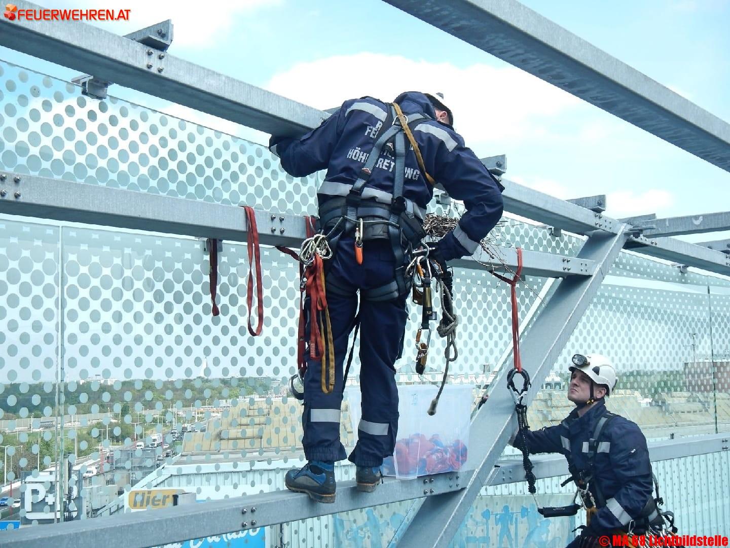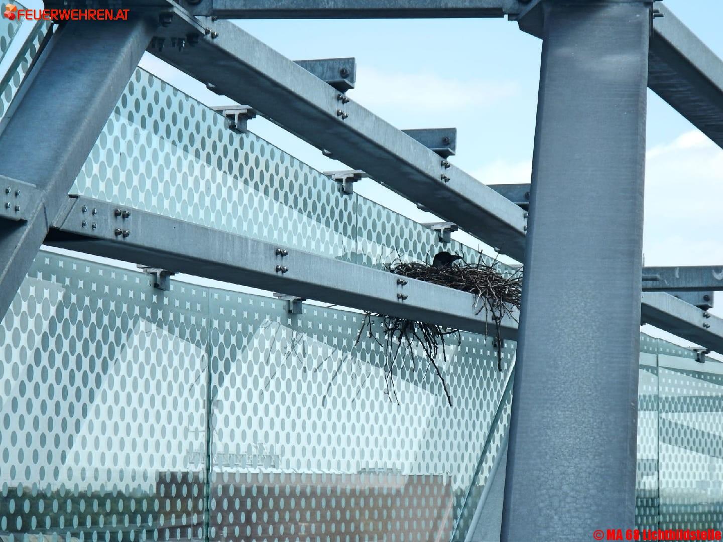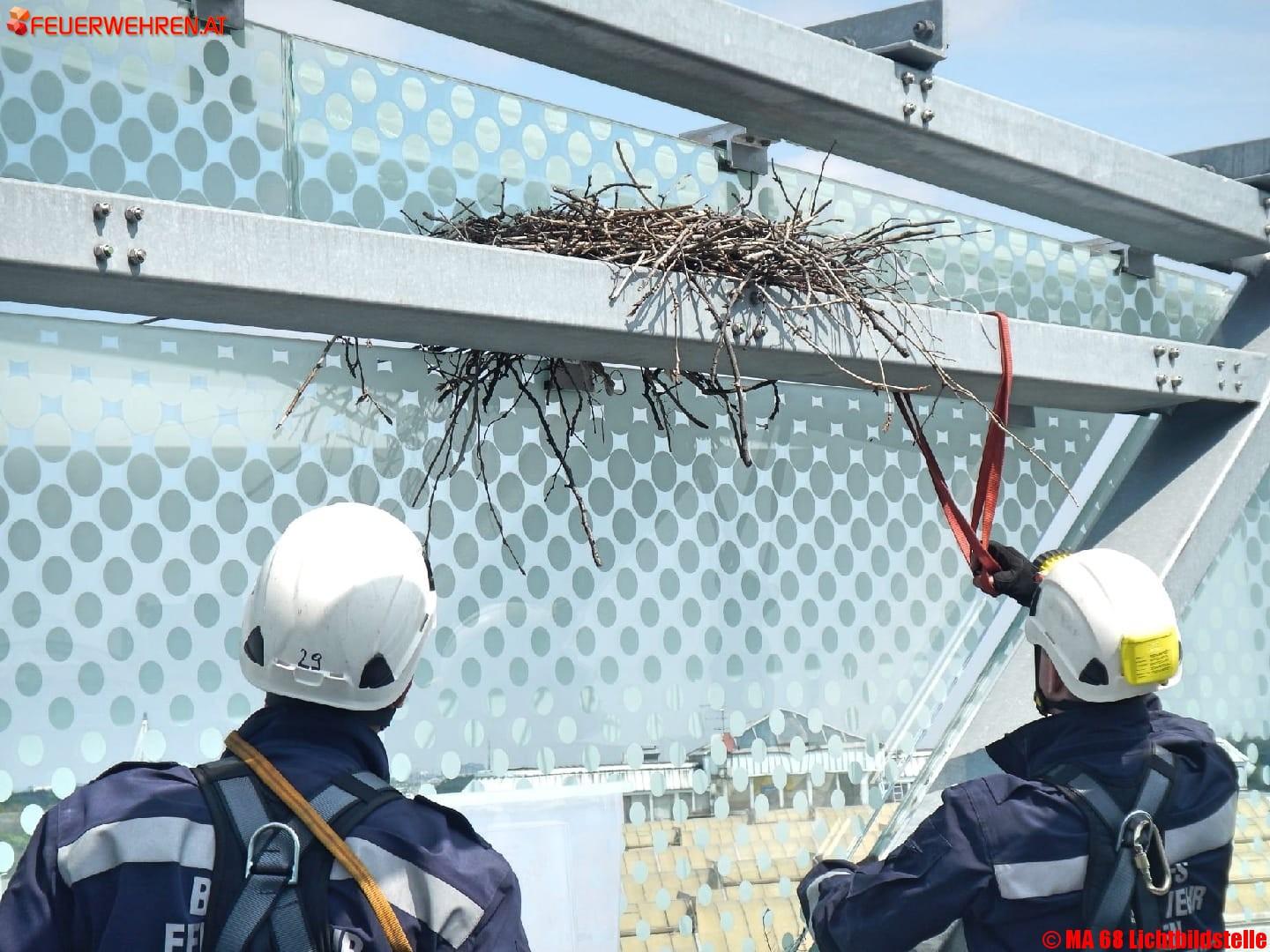 Da sich in unmittelbarer Nähe ein Hubschrauberlandeplatz befindet und der Hubschrauber eine Gefahr für Nest und Vogel darstellt bzw. umgekehrt, haben die Haustechniker die Feuerwehr verständigt. In Zusammenarbeit mit der Tierrettung wurde die Bergung des Nestes mit 5 Eiern durchgeführt. Zwei Höhenretter stiegen gut gesichert zu dem Nest auf und hoben es in eine Box der Tierrettung. Diese übernahm Nest und Eier und kümmerte sich um die weitere Betreuung.