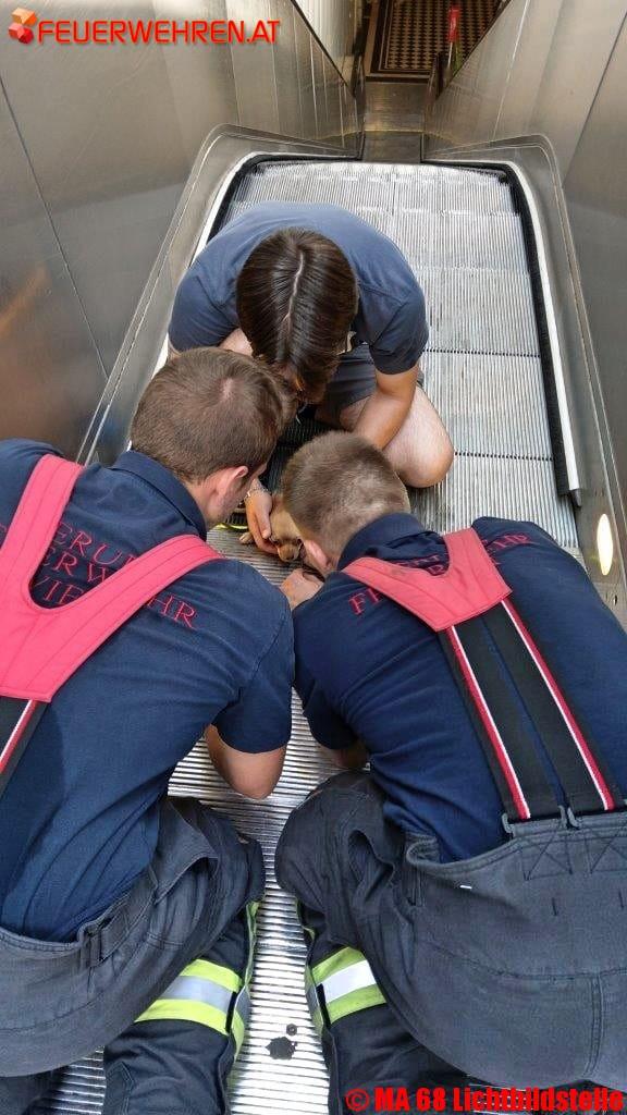 Im Bereich der U-Bahnstation Heiligenstadt wurde heute ein junger Haushund beim Ausstiegsbereich der Rolltreppe mit seiner linken Hinterpfote eingeklemmt.